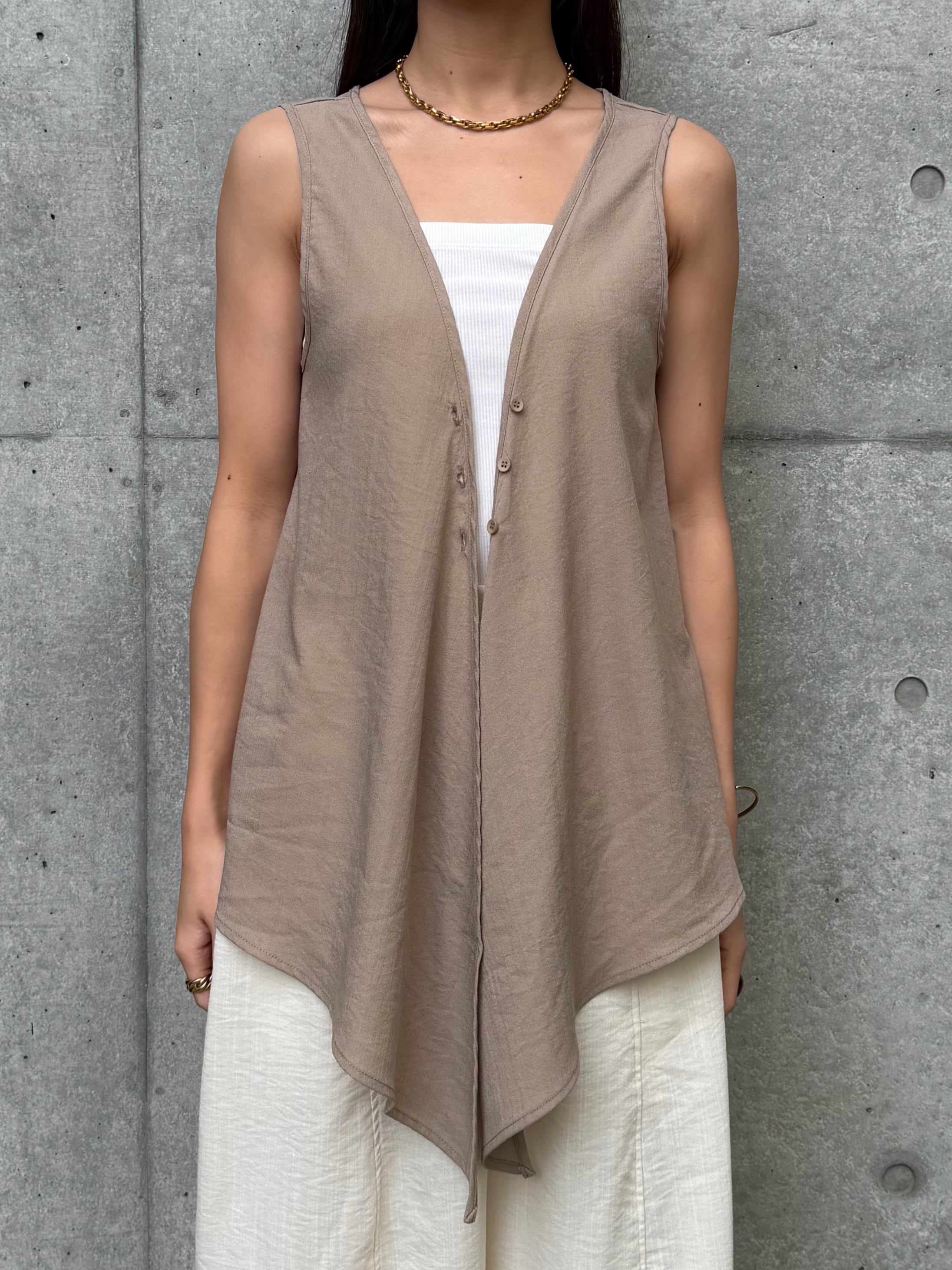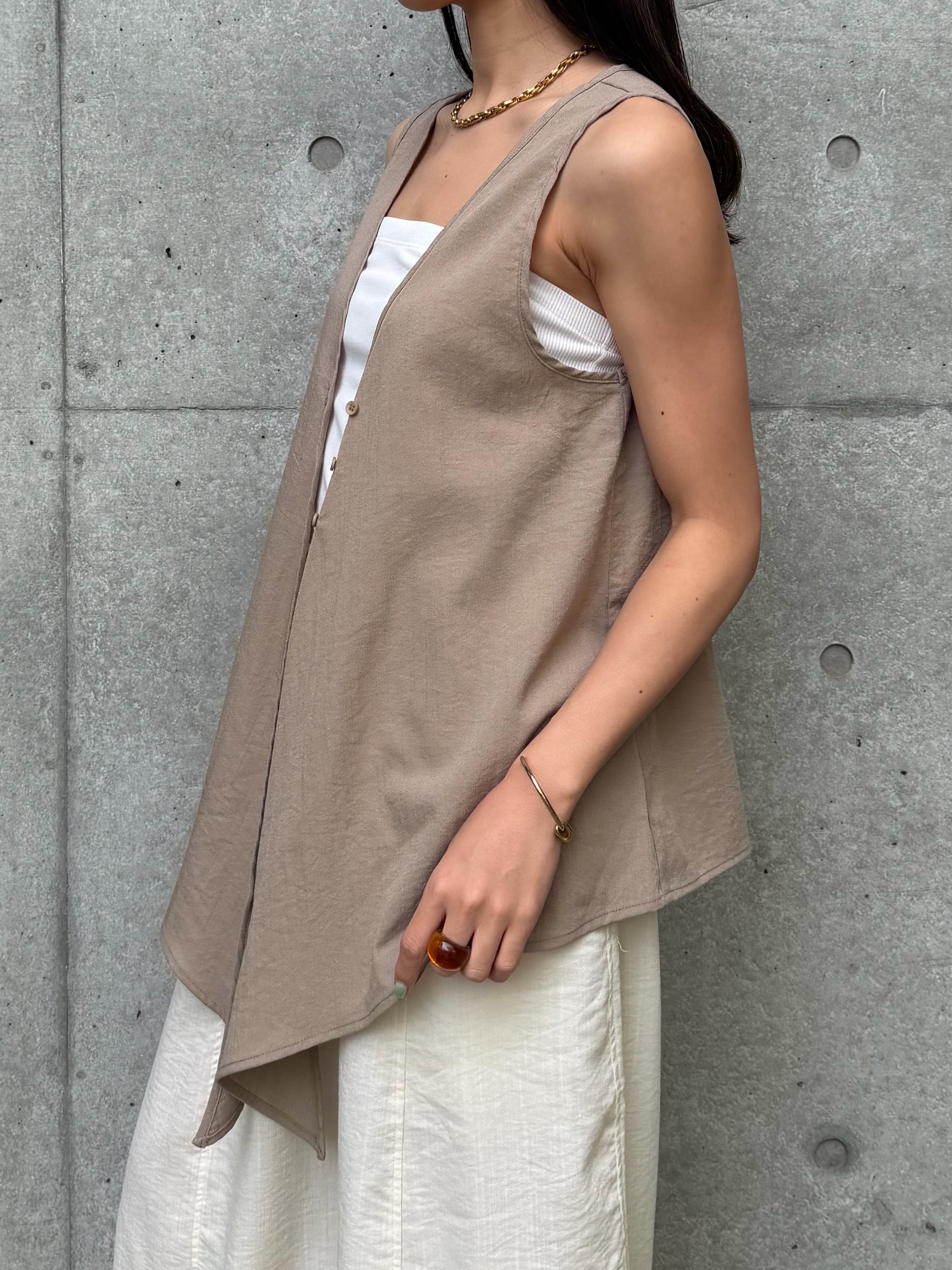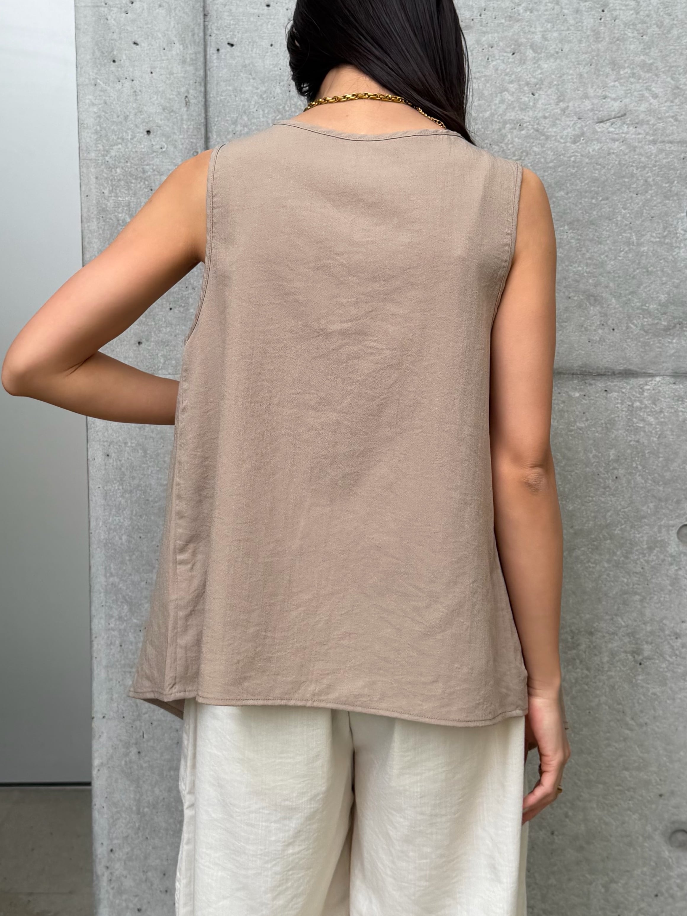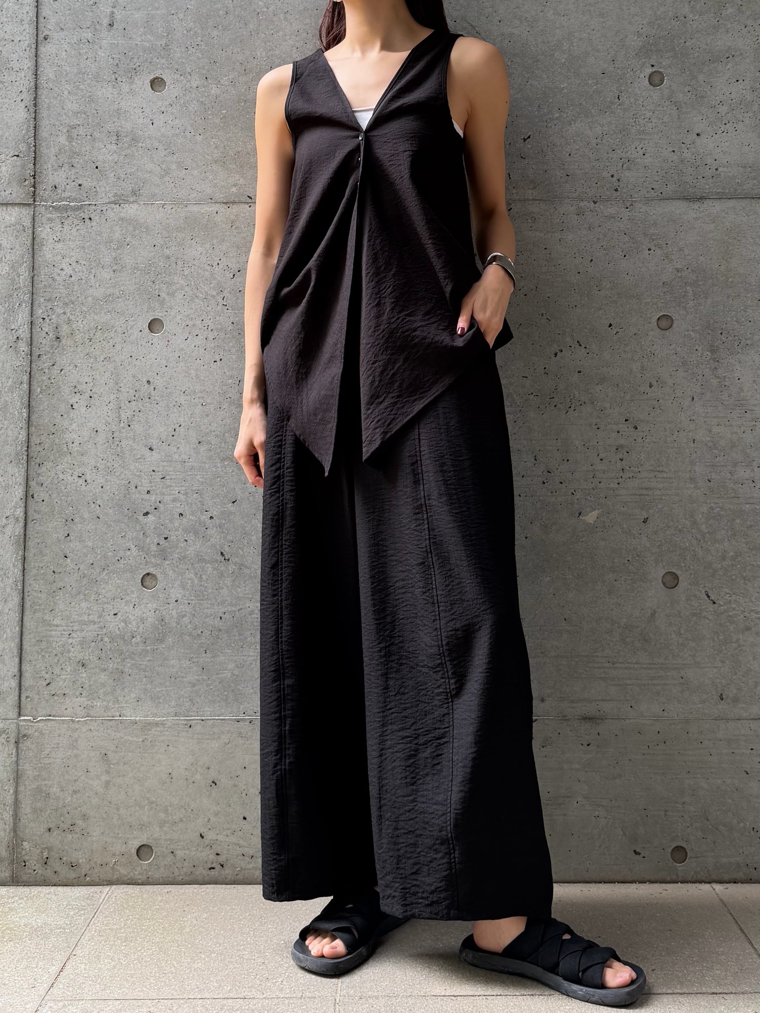 前後2WAYで着こなしを楽しめる、着回し力抜群のノースリーブトップス。フロントはシンプルでミニマルな印象、バックスタイルは深めのVデザインと揺れ感のあるイレギュラーヘムで、さりげない抜け感を演出してくれます。前後を逆にして着用すると、ボタンデザインがアクセントになったロングジレ風の着こなしも可能。気分やスタイリングに合わせて印象を変えられる、マルチWAY仕様が魅力です。程よく落ち感のある素材を使用し、身体のラインを拾いすぎず、涼しげで軽やかな着心地に。同素材のパンツと合わせたセットアップスタイルはもちろん、デニムやスラックスと合わせた単品使いもおすすめです。