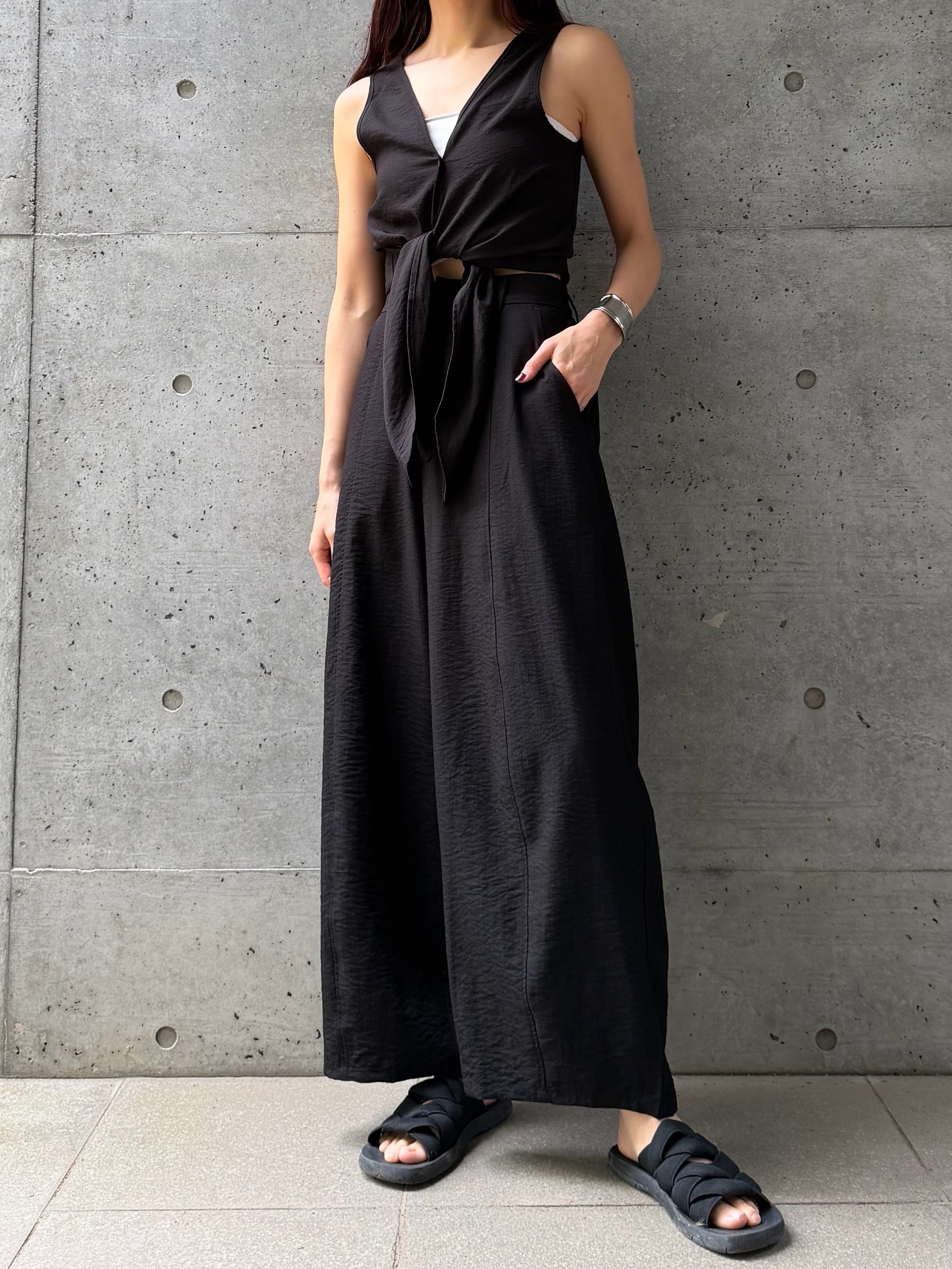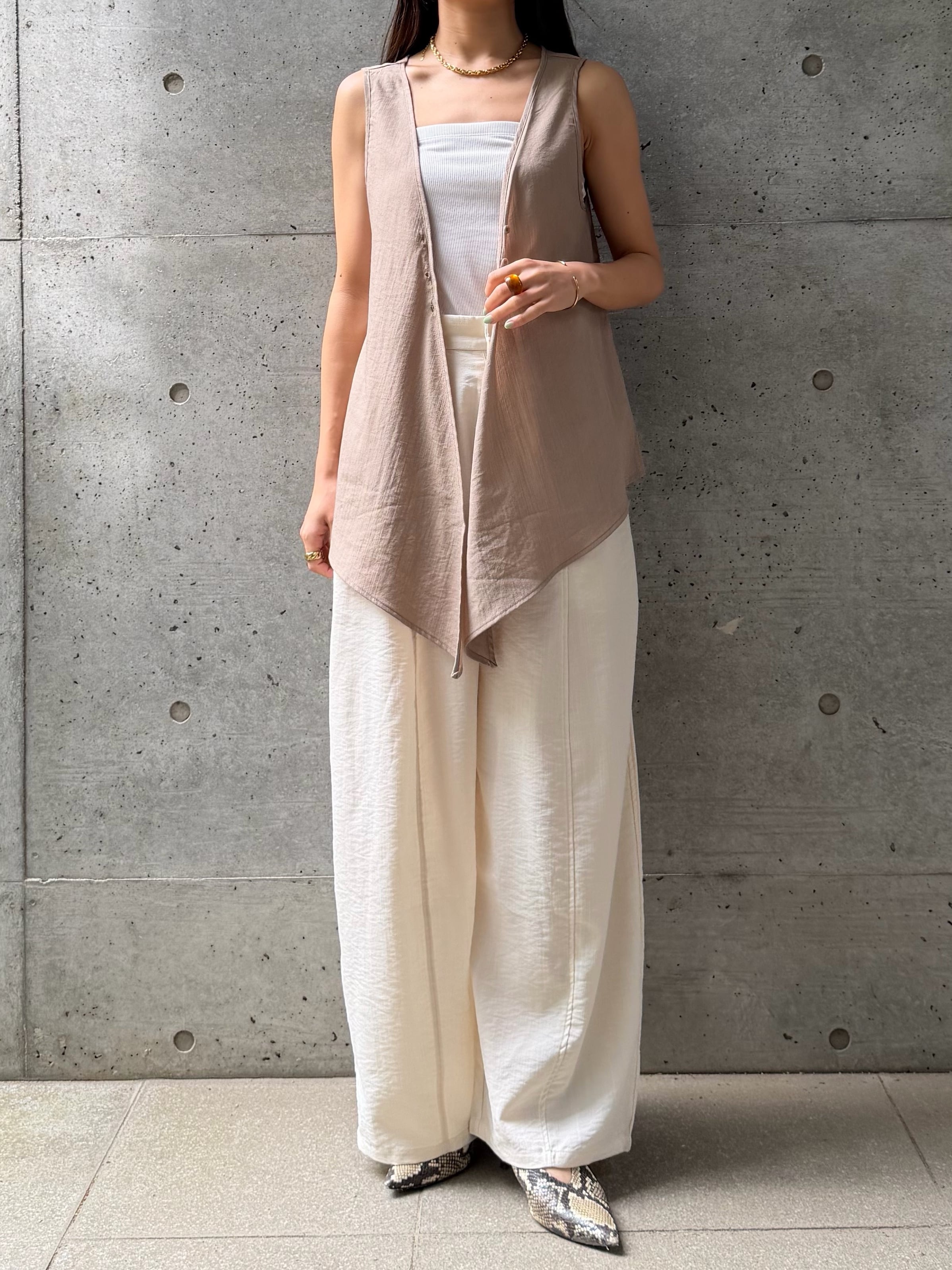 同素材の[CENTER SEAM PANTS(センターシームパンツ)【3776204】]とのセットアップ着用がおすすめ。3色展開で、あえてカラー違いのパンツと合わせたミックスコーデもこなれた印象に仕上がります。シンプルな面をフロントにするとミニマルで洗練された印象になり、ワイドパンツやスラックスと合わせるだけで大人っぽいスタイリングが完成。前後を逆にして着用すれば、ボタンデザインがアクセントになったジレ風の着こなしに。インナーにタンクトップやキャミソールを合わせることで、抜け感のあるレイヤードスタイルを楽しめます。足元はフラットサンダルでラフに、ヒールサンダルで女性らしく仕上げるのも◎