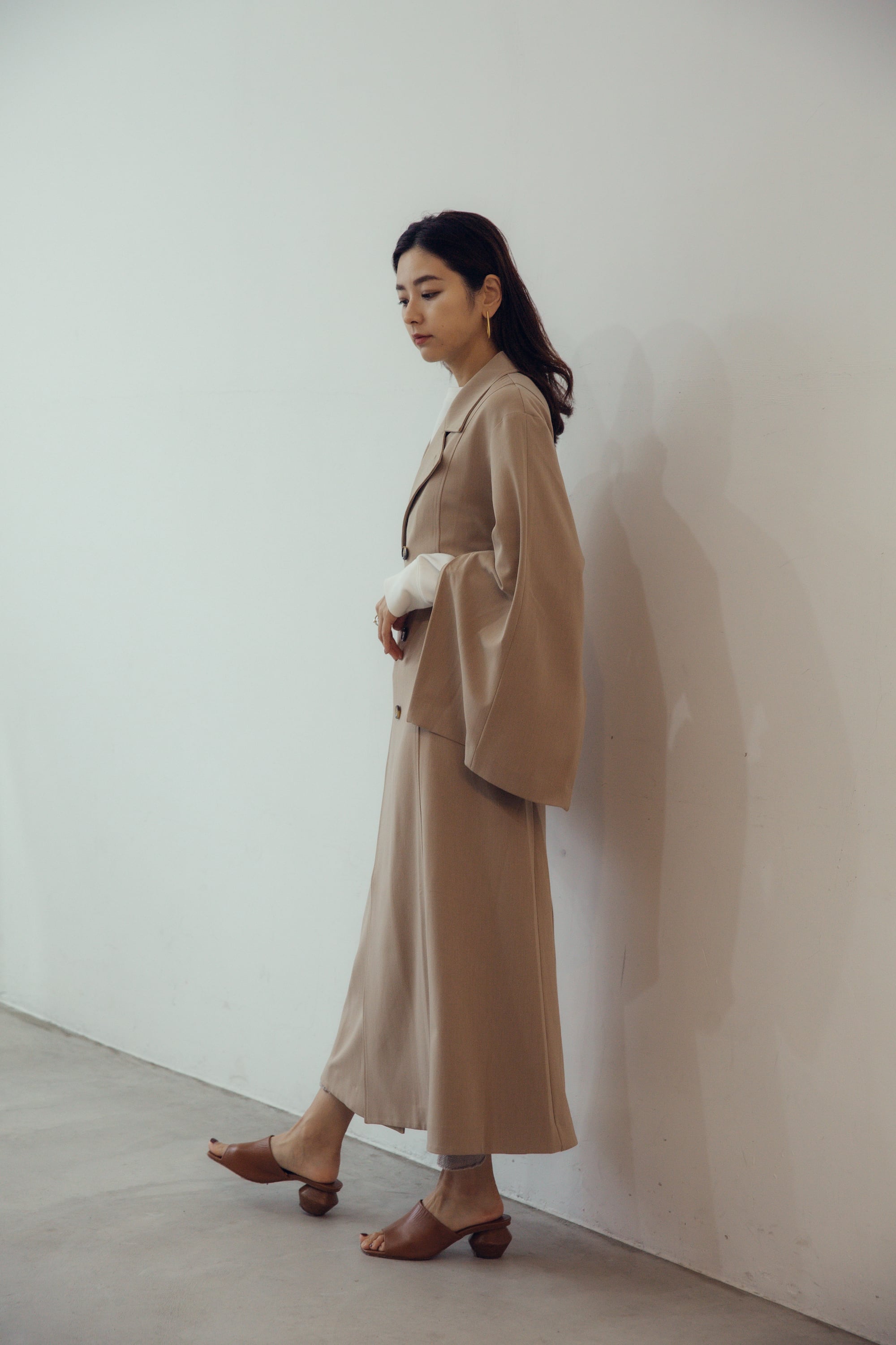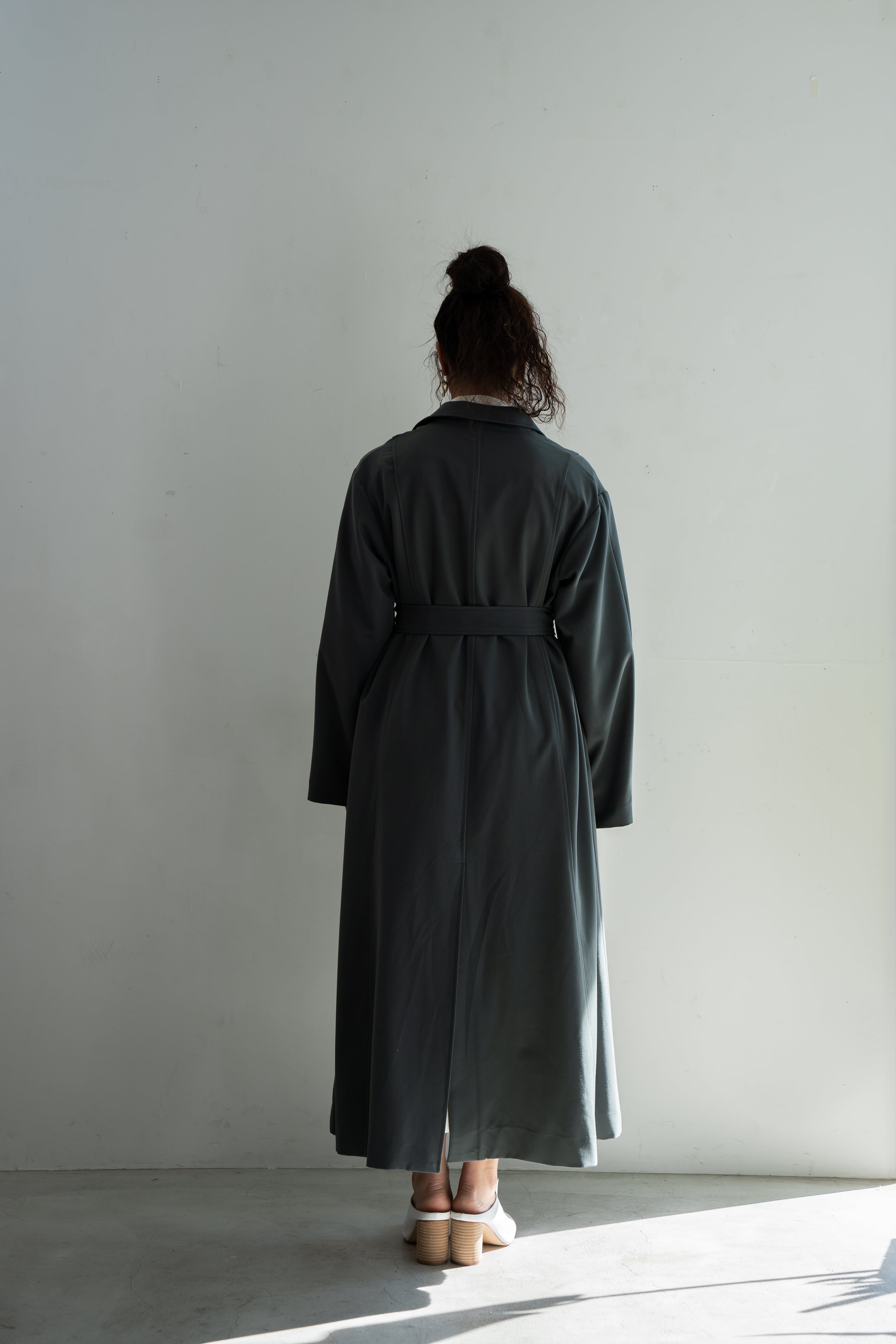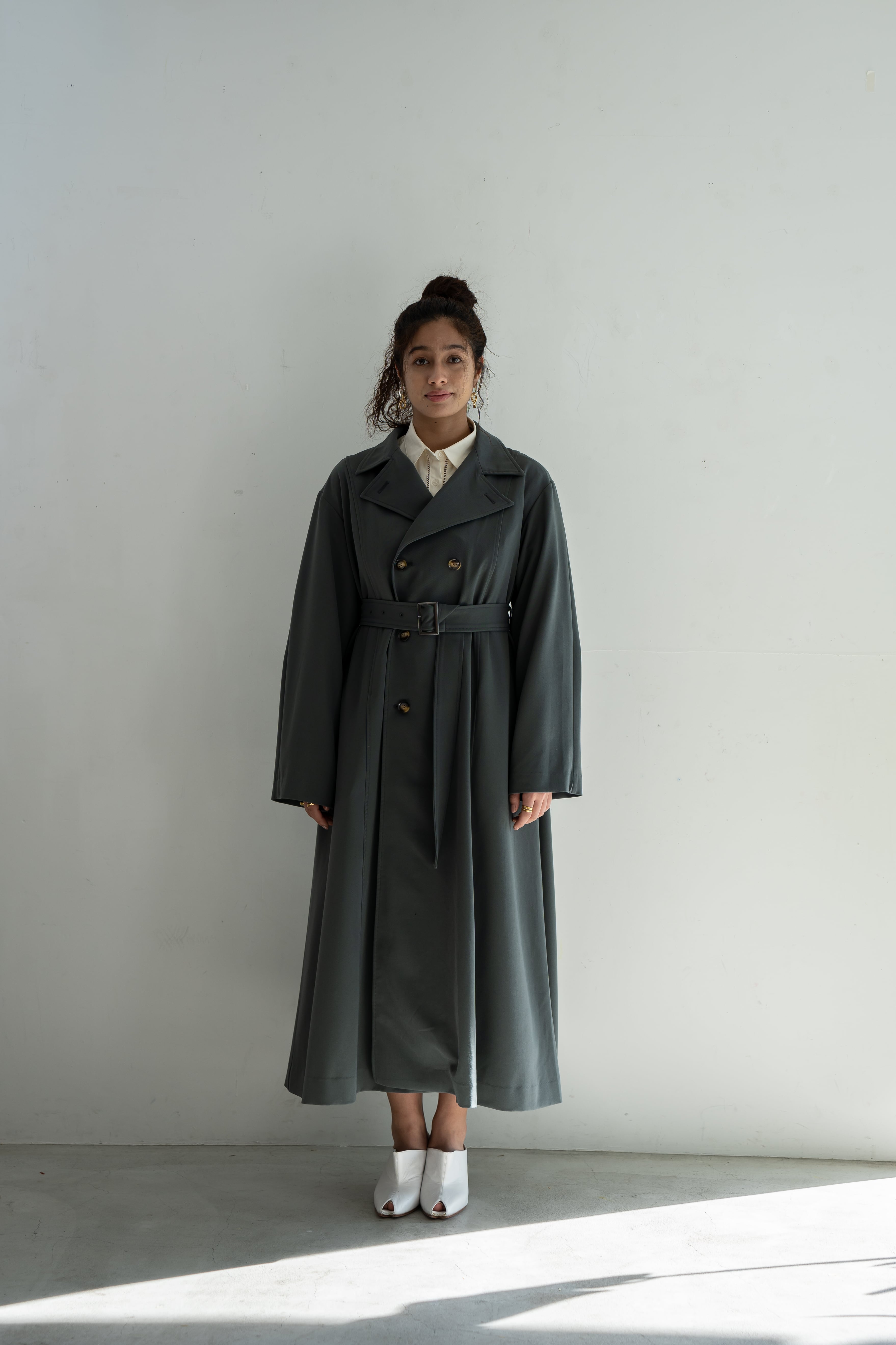 オフィスカジュアルはもちろんのこと、スウェットパンツやデニム、スニーカーなどカジュアルアイテムとの相性もよくマルチ に活躍してくれます。ワンピースの上に羽織っても、トレンチコートの着丈たっぷりでバランスよくスタイリングがきまります。