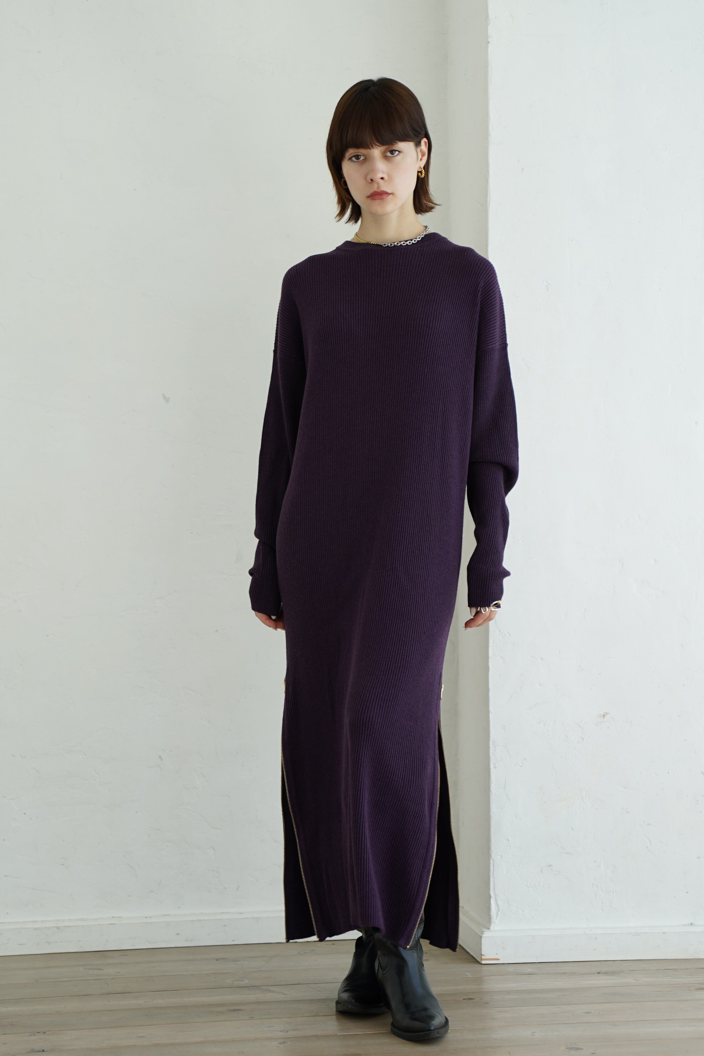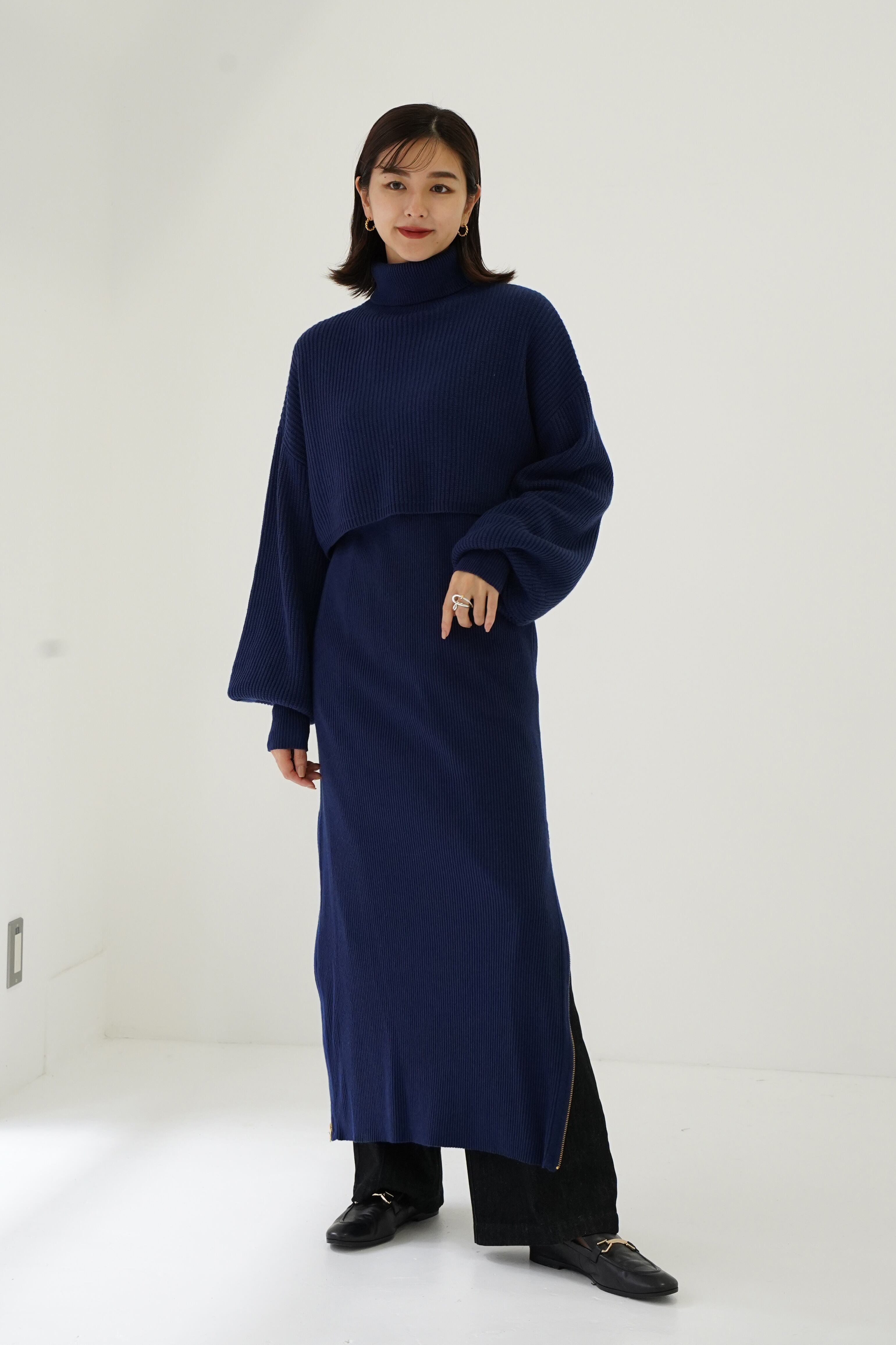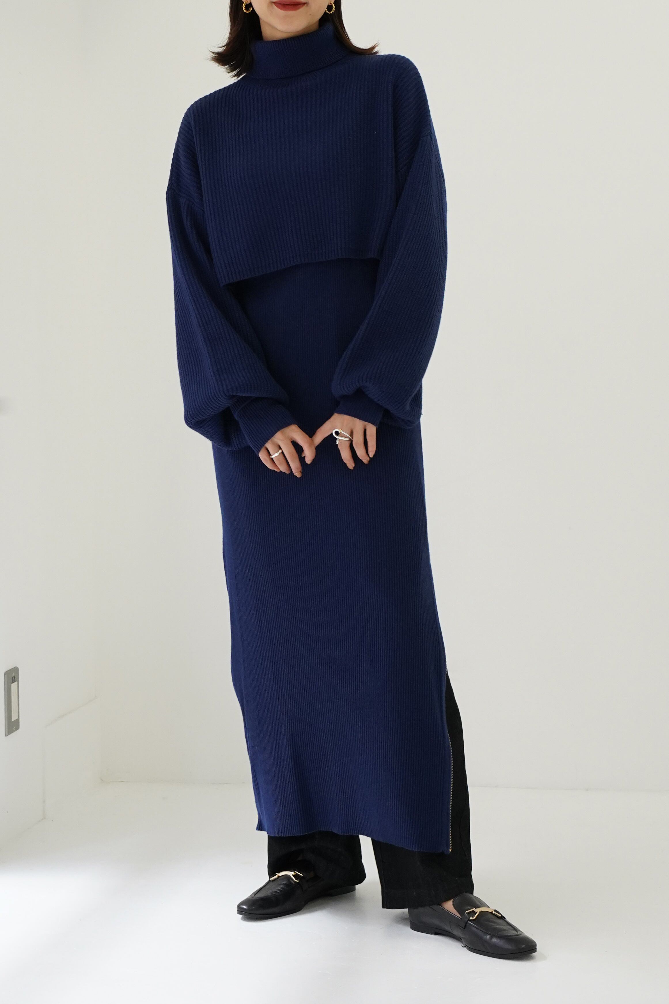 ハイネックプルオーバーとワンピースがセットになったニットワンピース。女性らしいシルエットが特徴です。インナー OPはシンプルなルックスですが、深めのサイドスリットが入っているのでお好きなところでサイズ調節可能です。体のラインを拾いすぎないサイジング、袖のボリューム感にこだわりました。