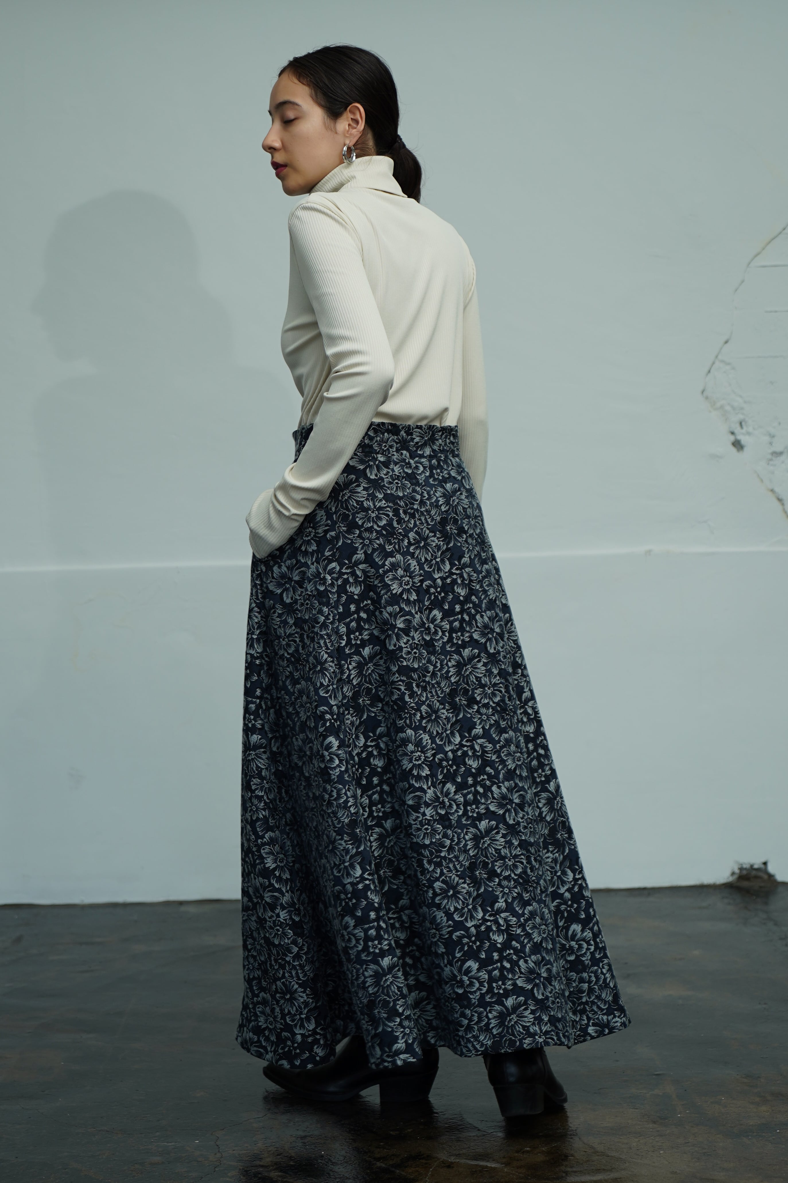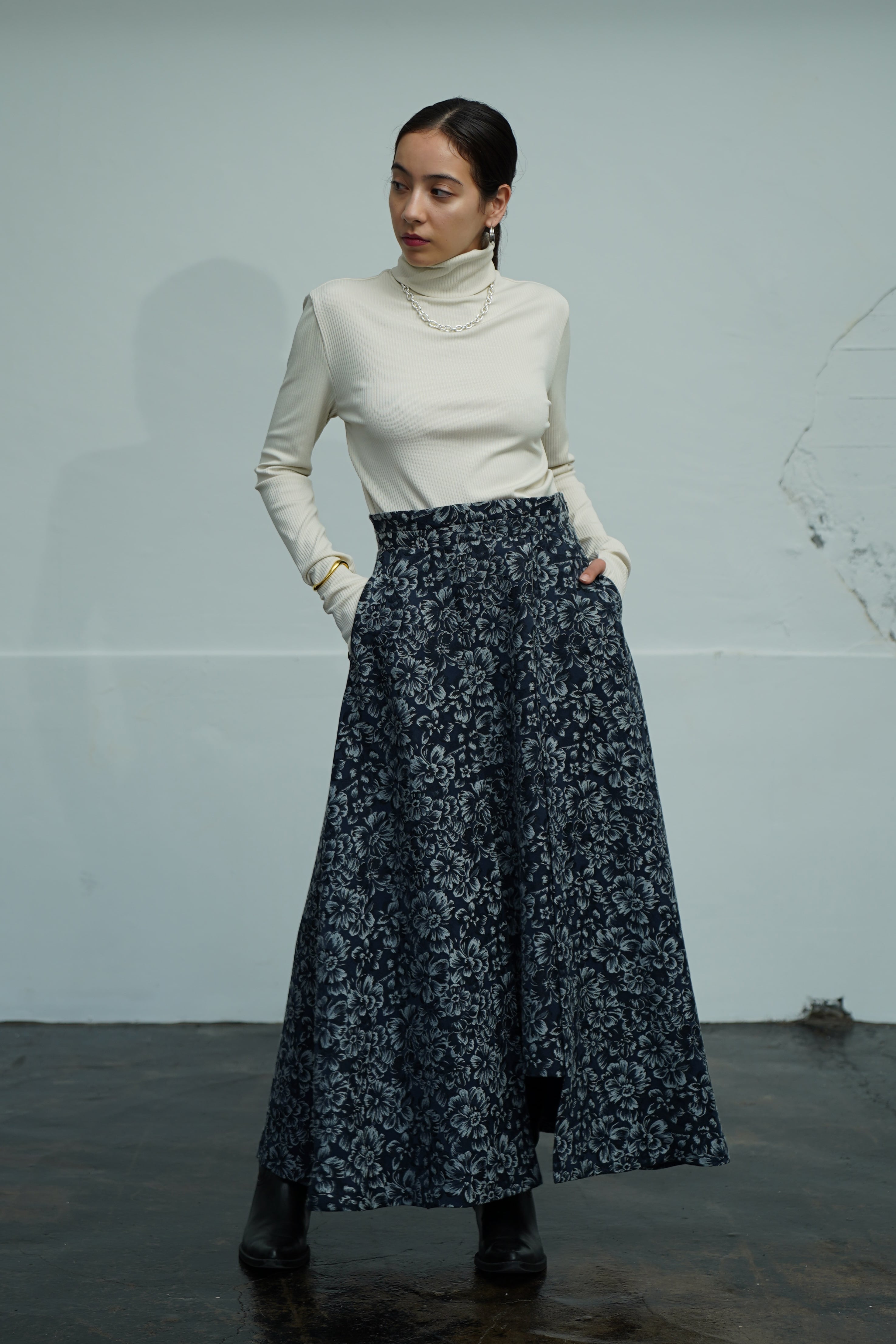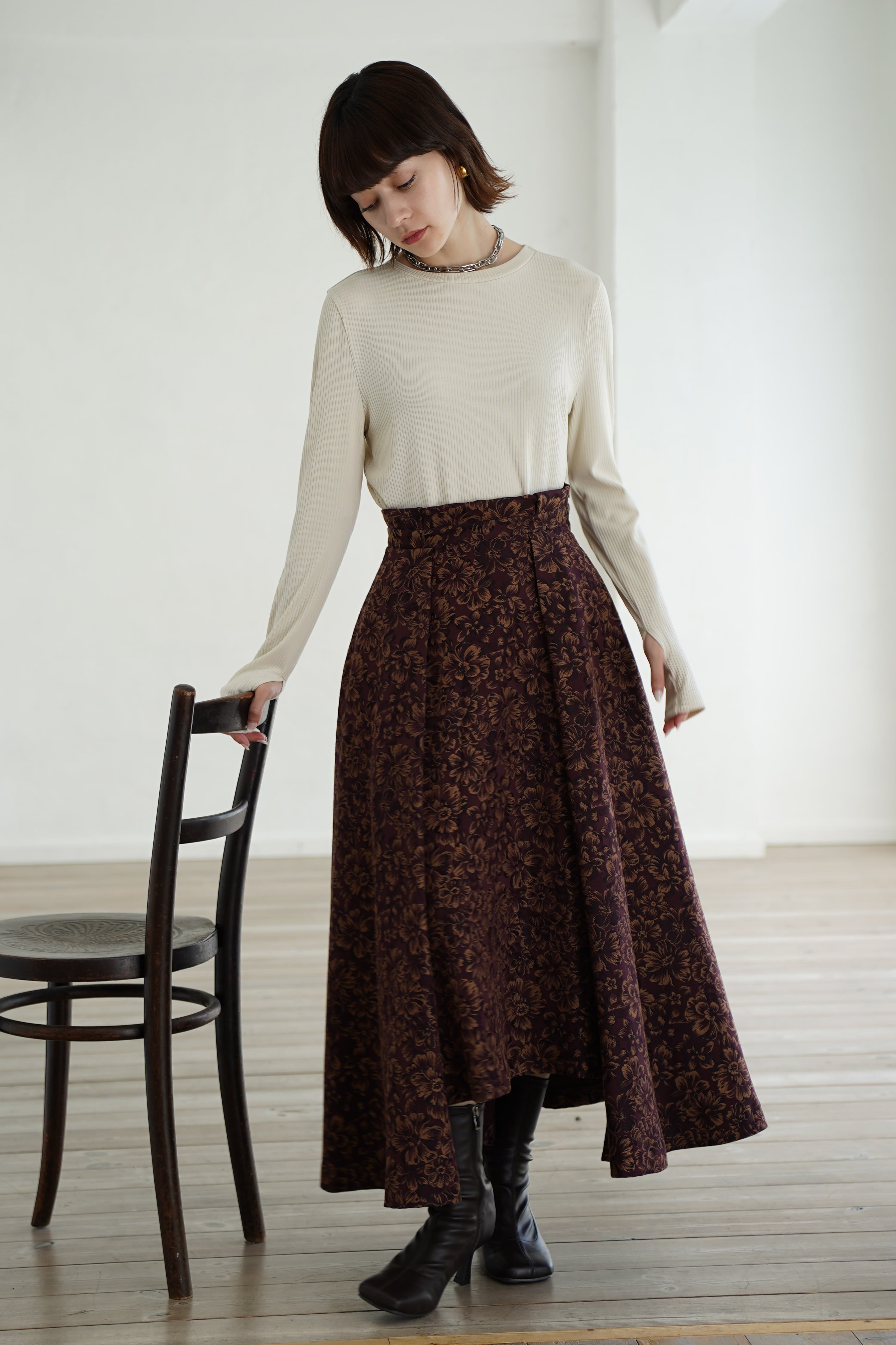 CIEL'AIR定番のフレアスカート。今シーズンは中肉厚なジャガード生地でたっぷりのAラインで仕上げました。裾部分のカッティングでブーツなどとの相性がよく一歩足を踏み出すたびに揺れ感楽しめます。後ろのみゴムになった仕様で着心地もよく、キレイめなスタイリングが完成いたします。