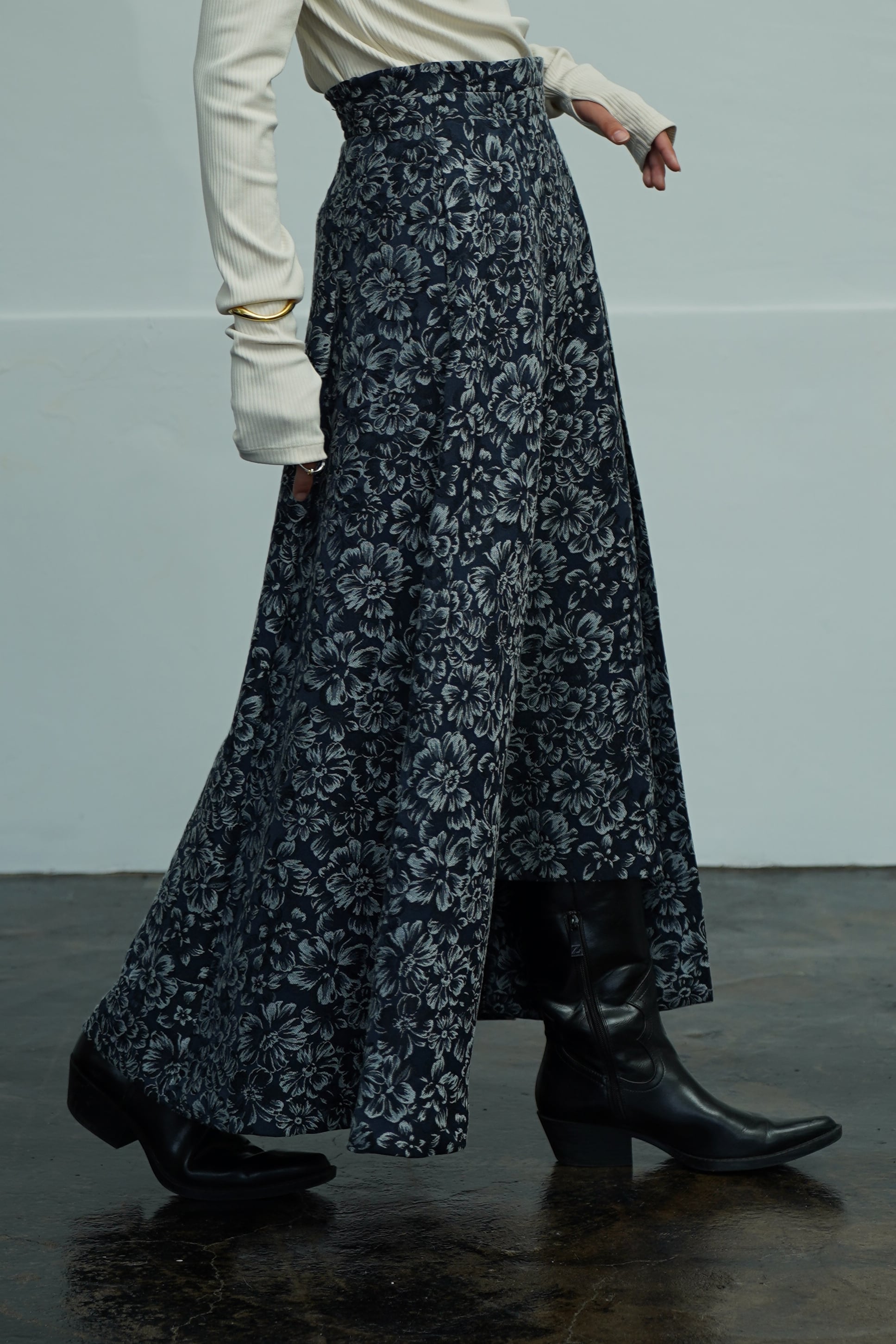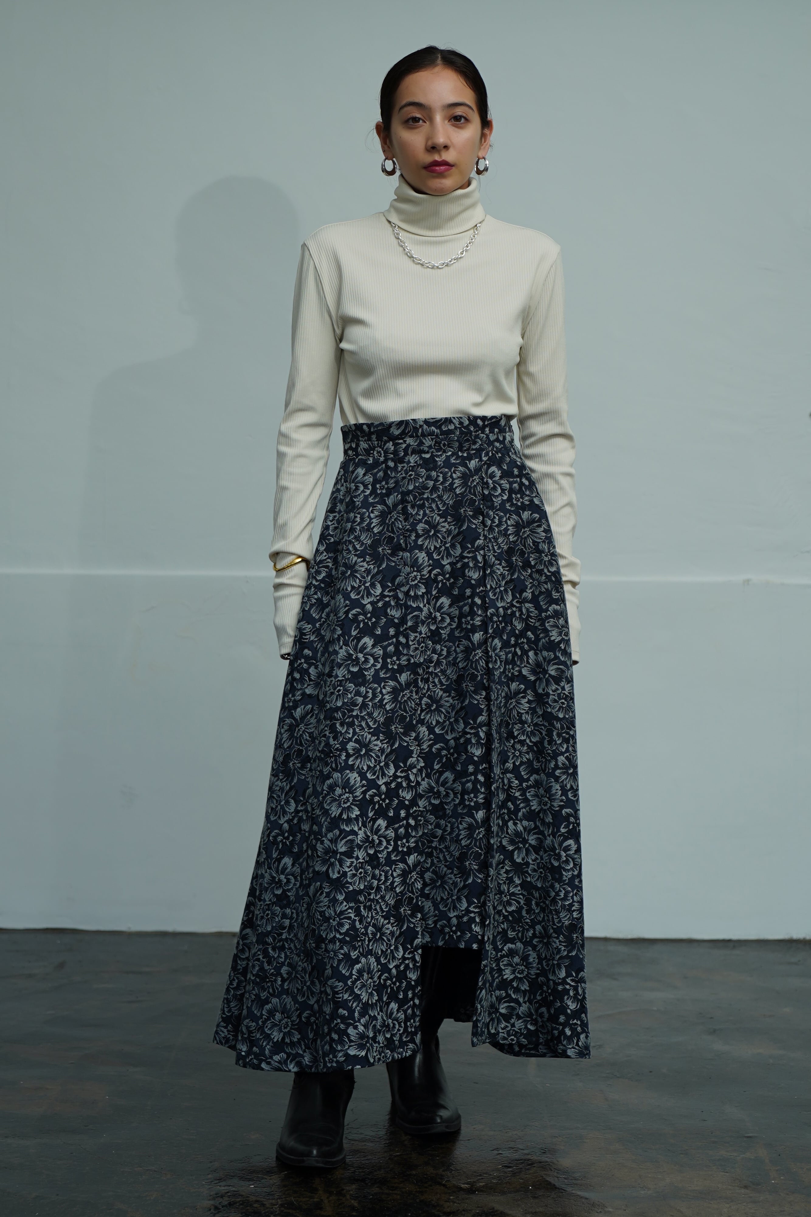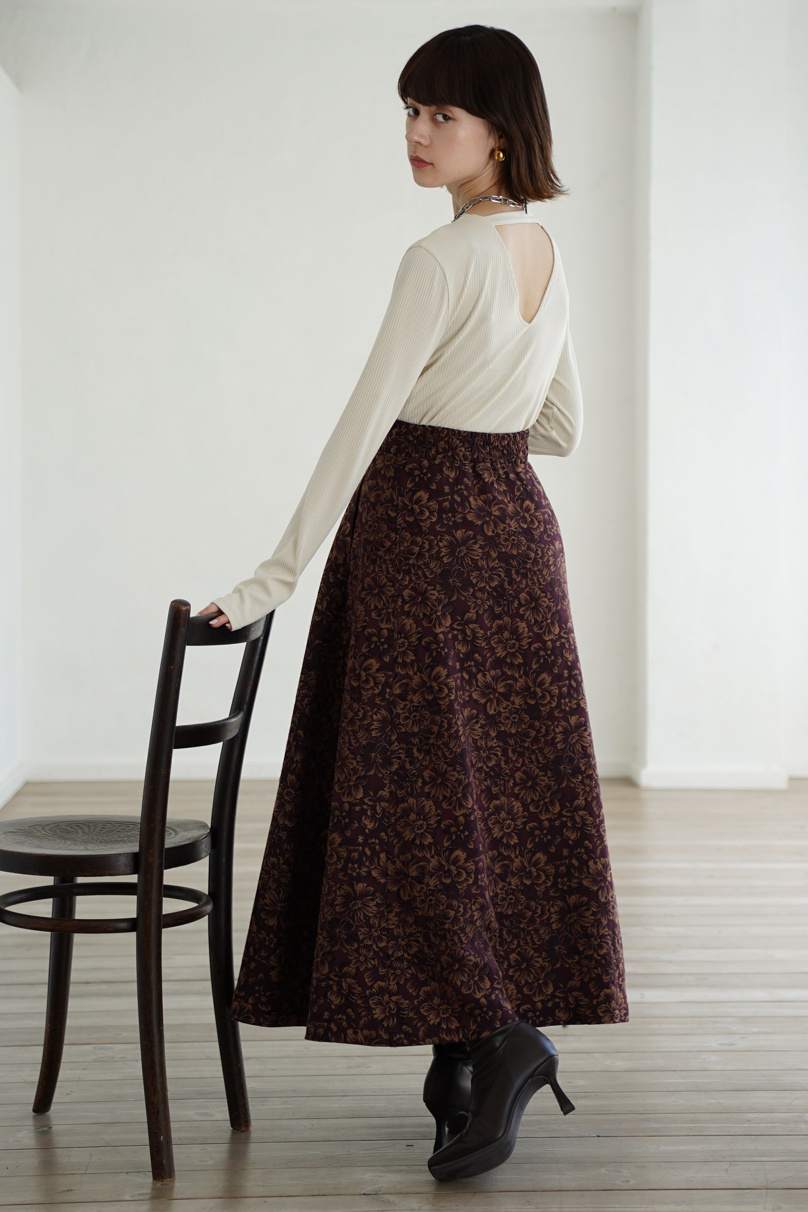CIEL'AIR定番のフレアスカート。今シーズンは中肉厚なジャガード生地でたっぷりのAラインで仕上げました。裾部分のカッティングでブーツなどとの相性がよく一歩足を踏み出すたびに揺れ感楽しめます。後ろのみゴムになった仕様で着心地もよく、キレイめなスタイリングが完成いたします。