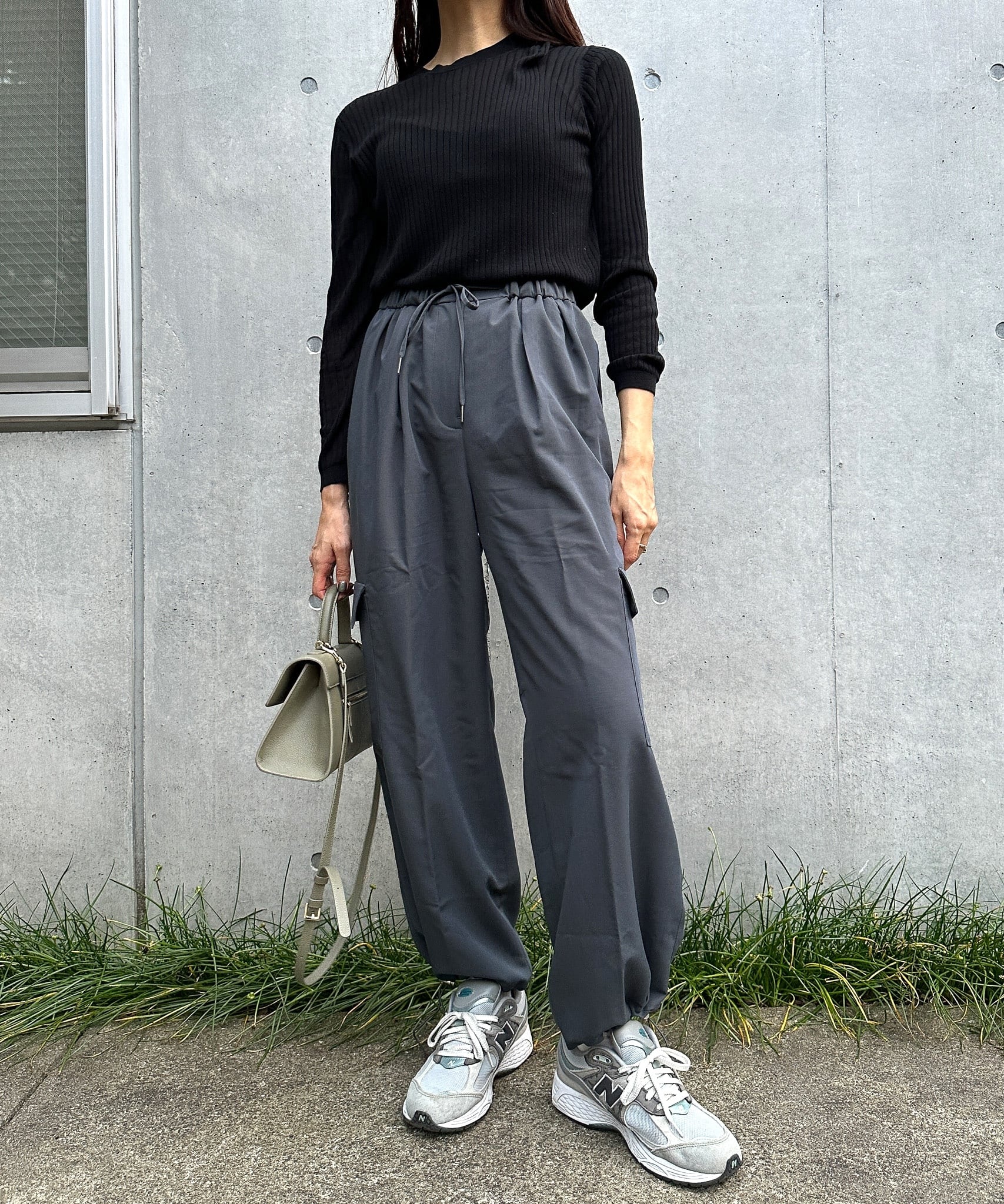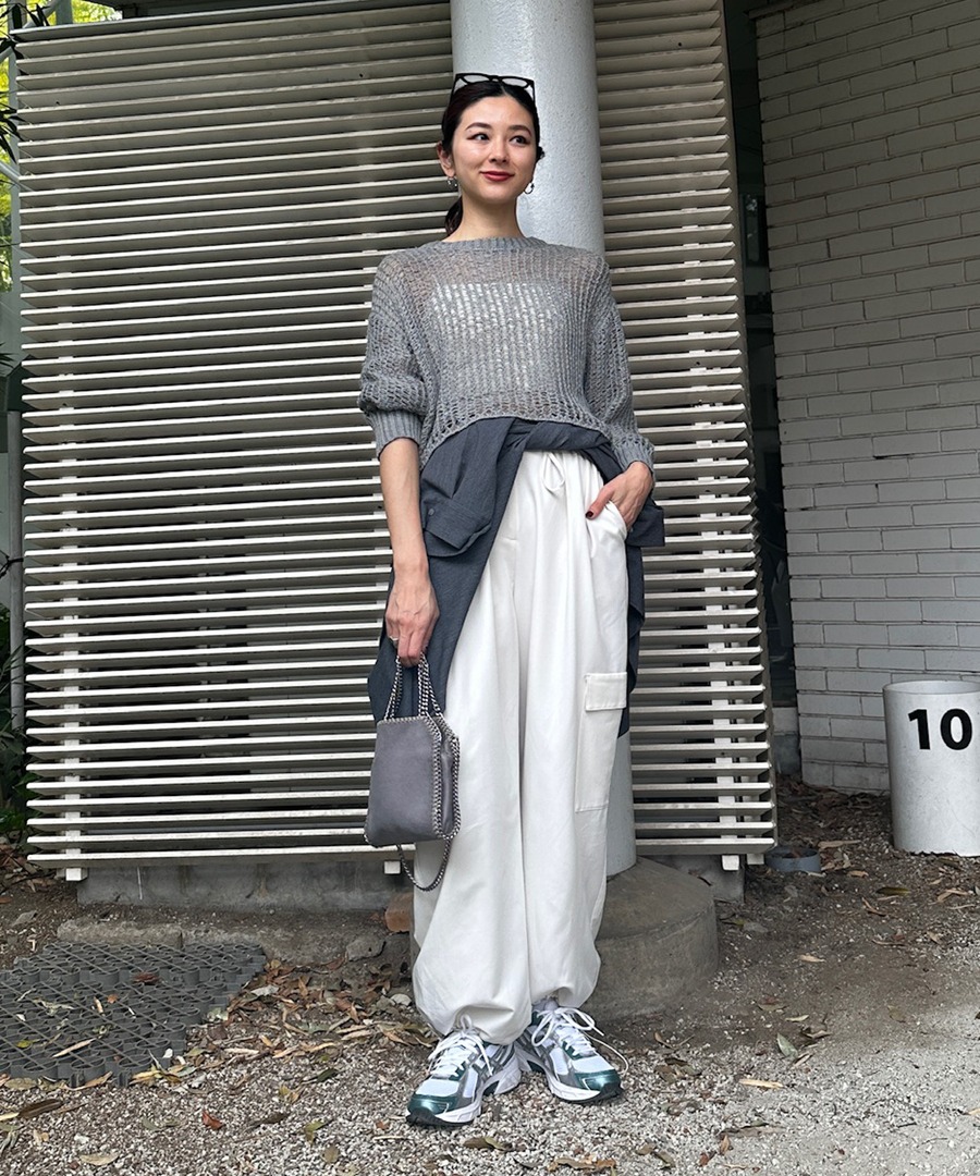骨格ストレートは身体に厚みがありハリのある体型なので、ボリューム感のあるカーゴパンツはあまり得意とされていませんが、落ち感あるTR素材なので問題なくご着用いただけます。パンプスやヒールと合わせて縦長効果を意識してみることがおすすめです。