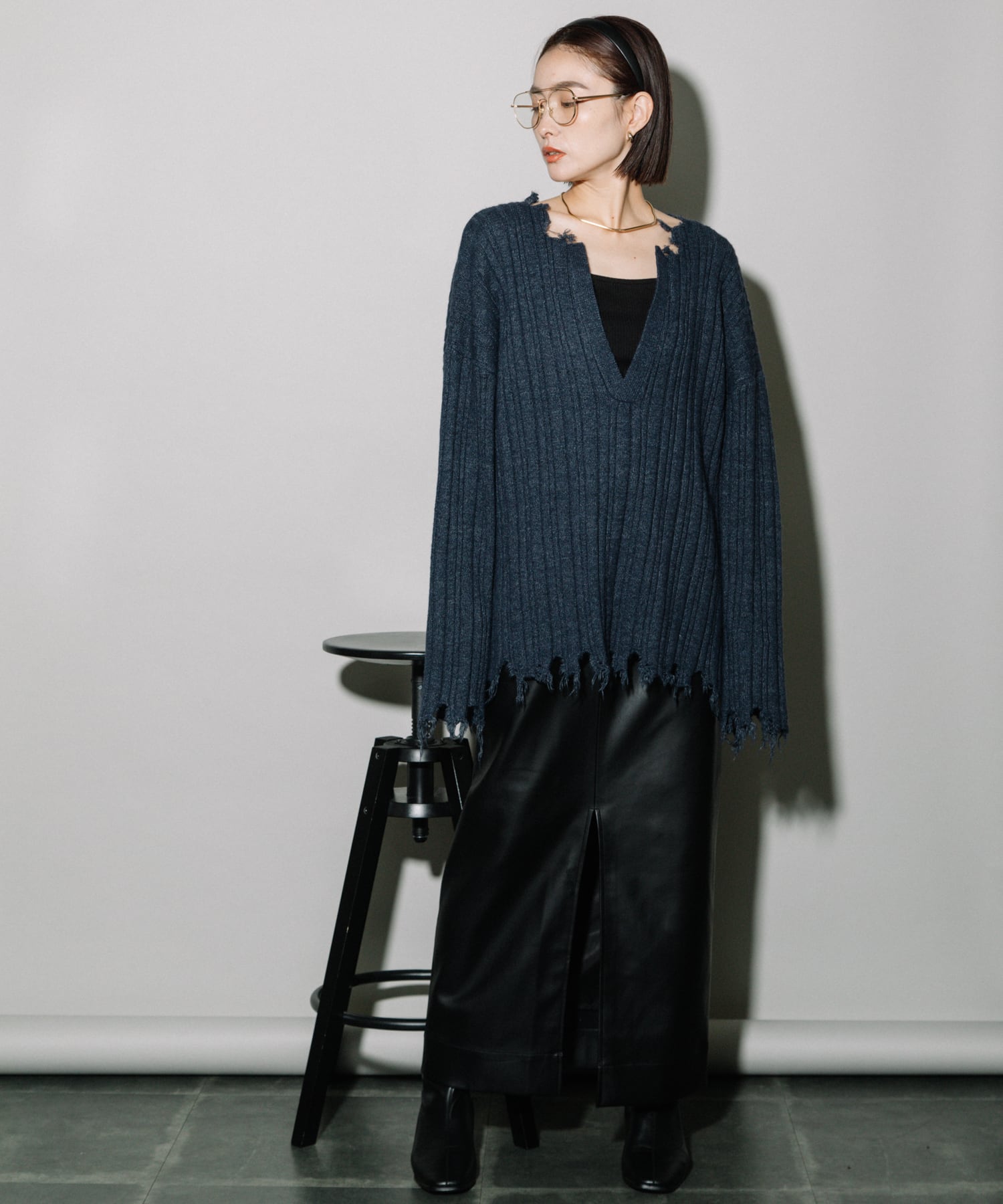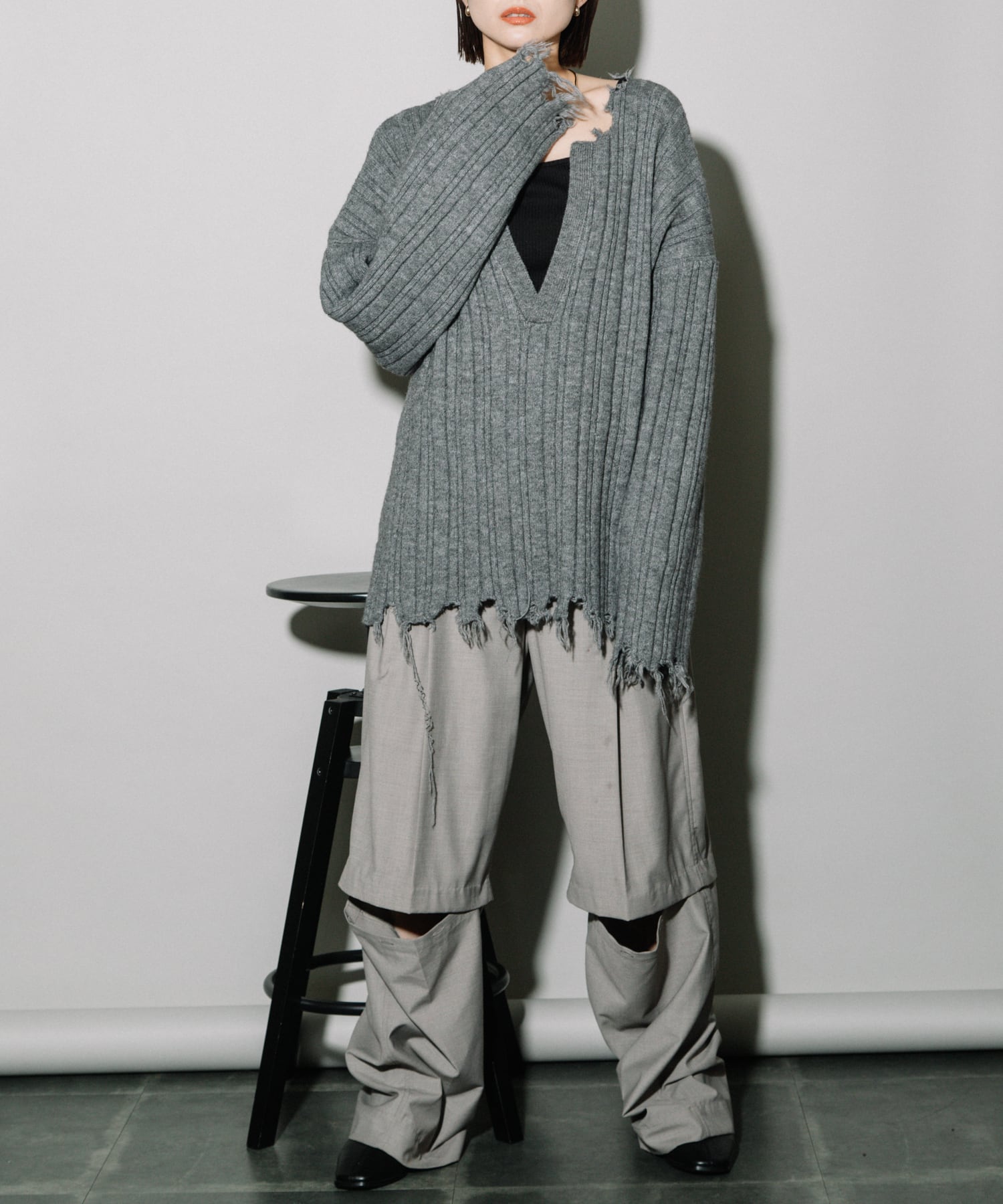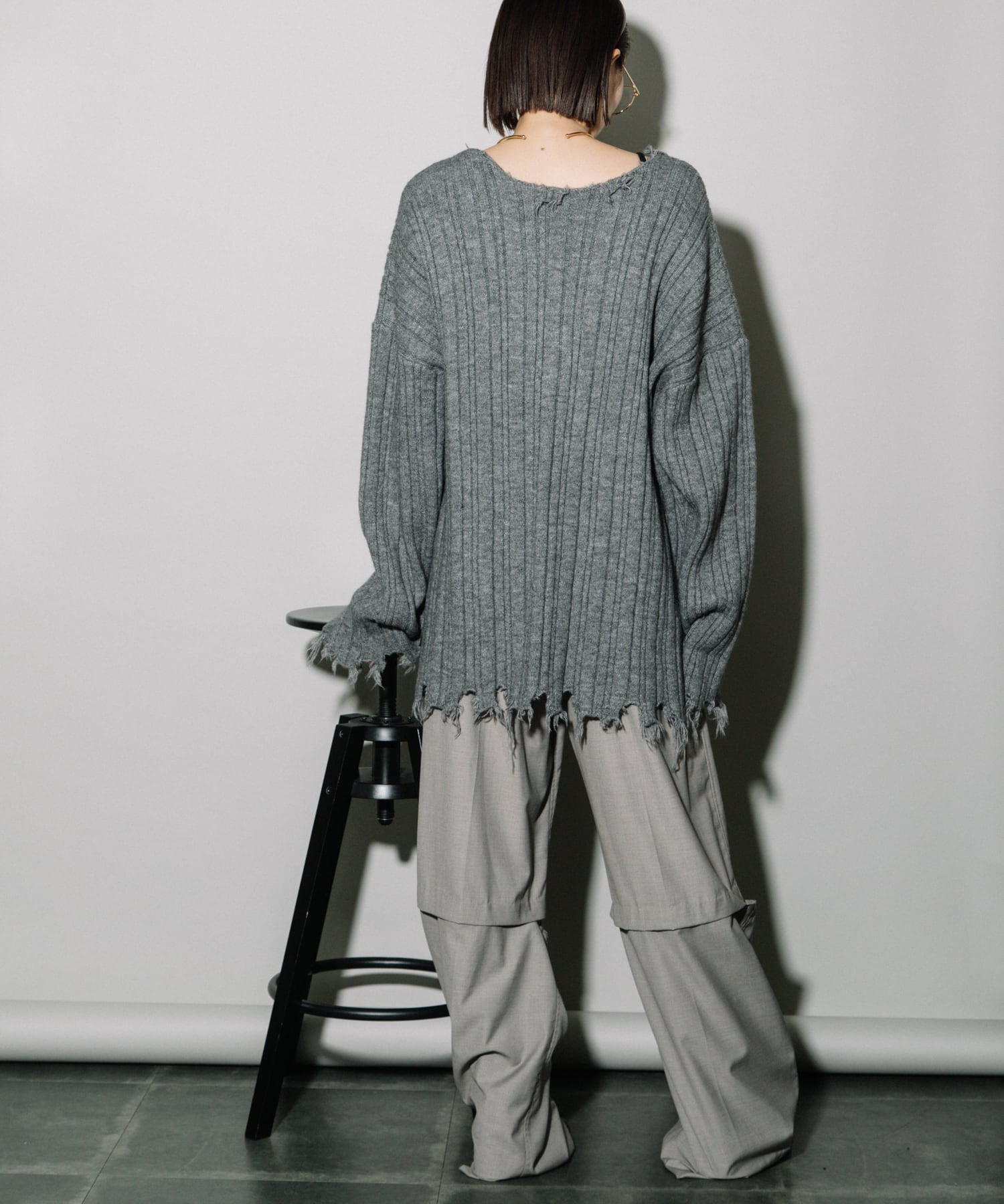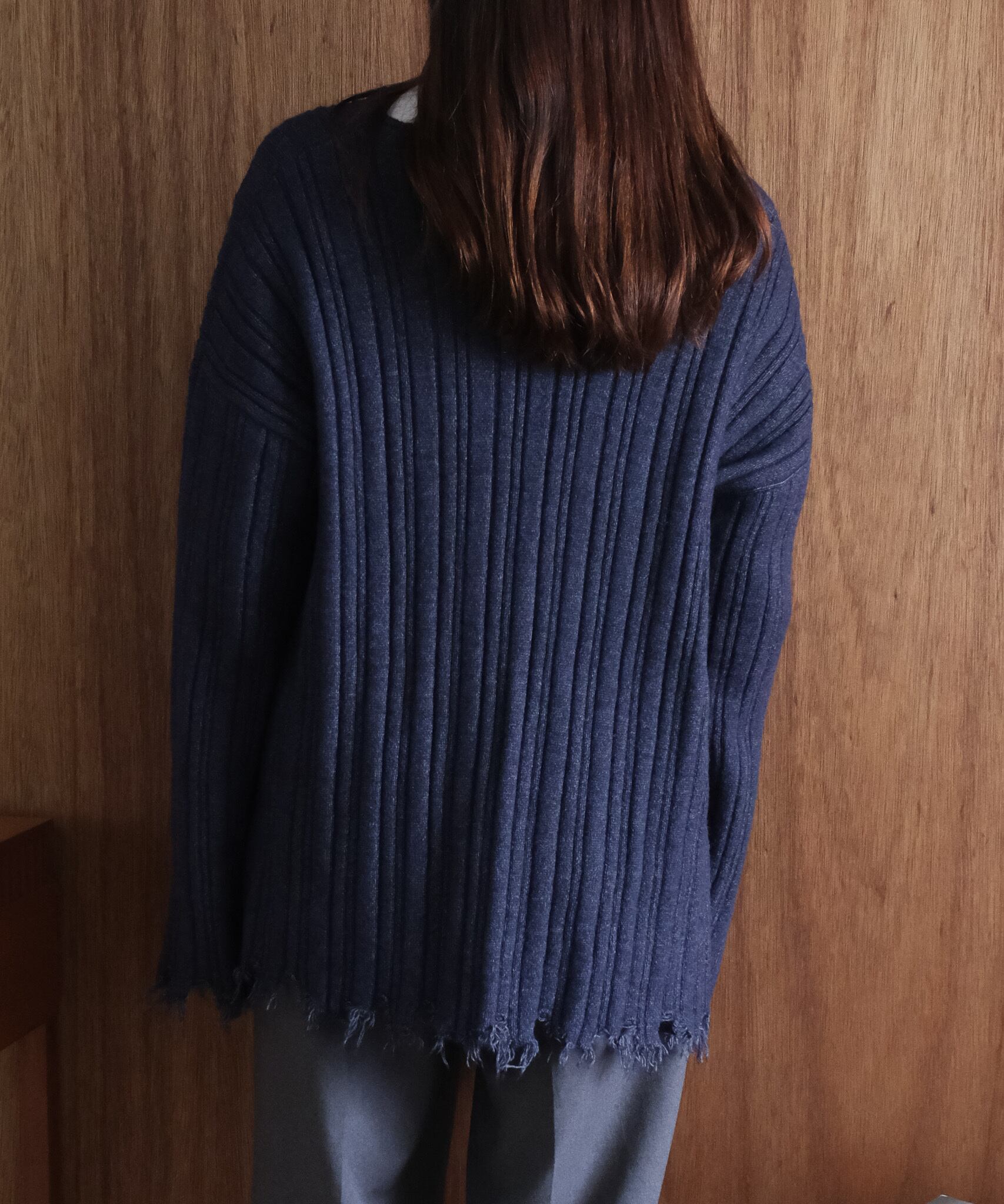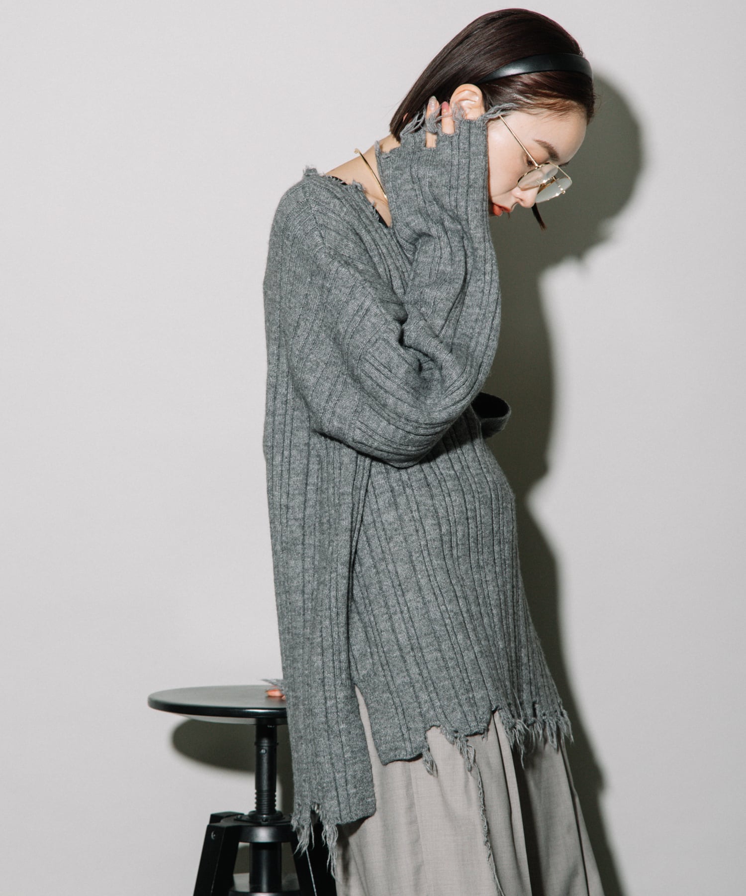 \手洗い可能/VINTAGE感楽しめる大胆なダメージデザインが特徴のニット。裾は伸ばしても折り返しても2WAYでお楽しみいただけます。ちくちくとしない着心地で旬なコーデが完成します。丈感は長めなので、気になる腰回りをすっぽりとカバー。インナー次第でロングシーズン着回し可能なアイテムです。