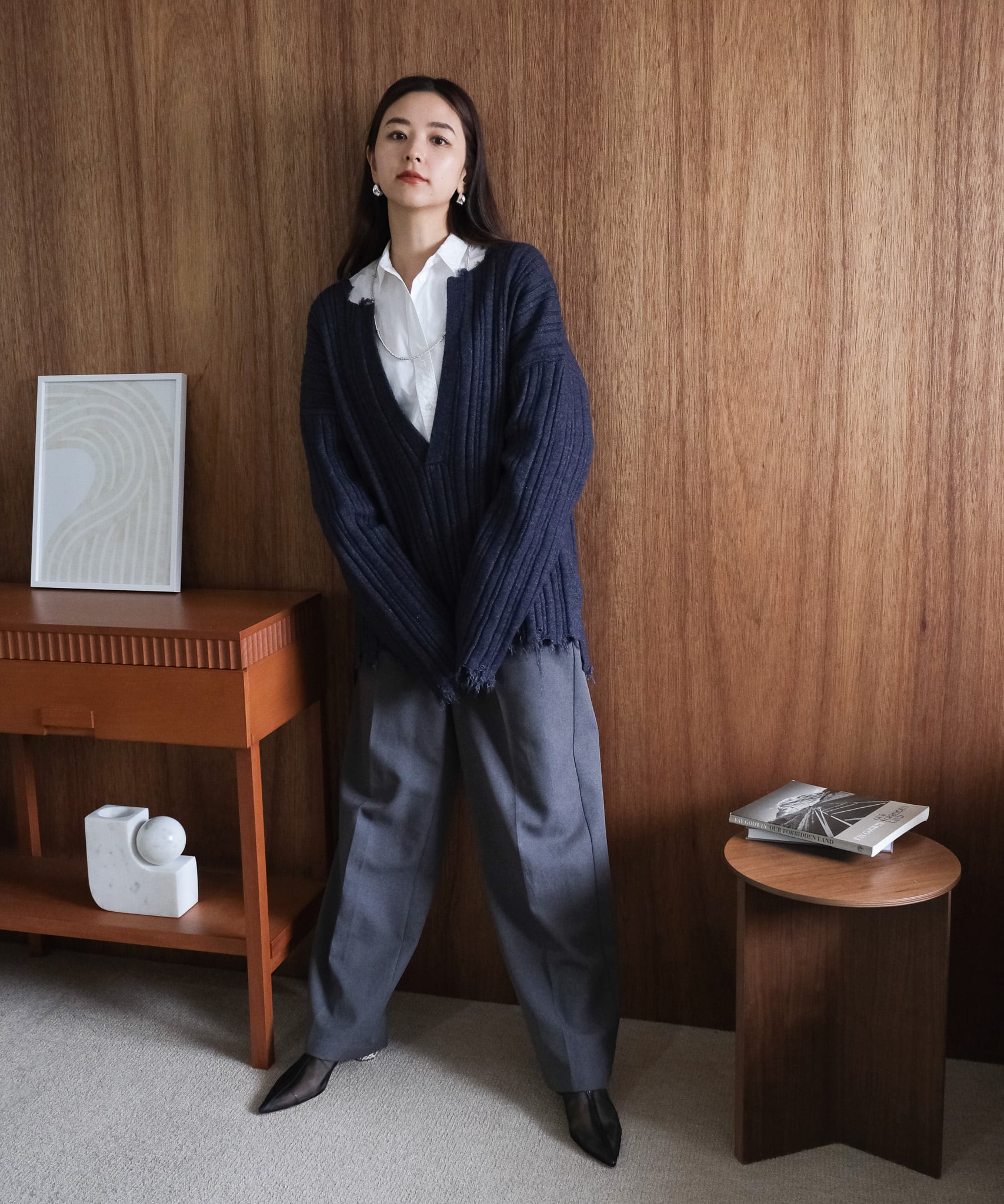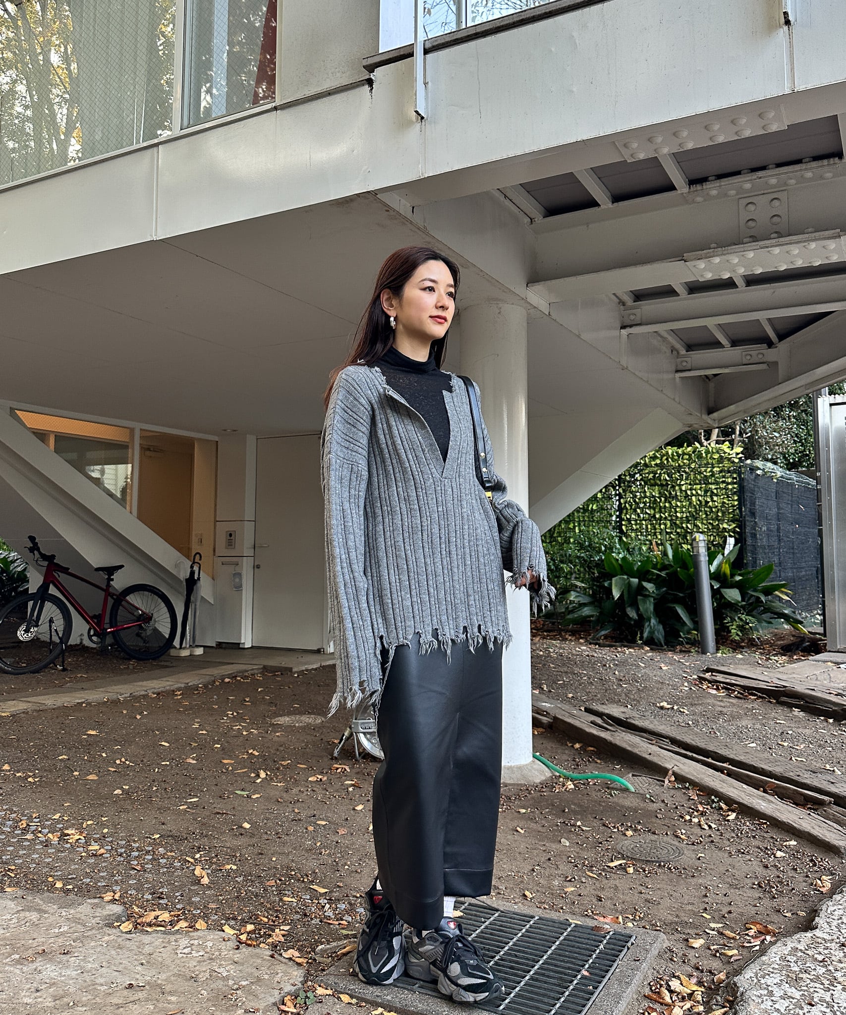 ぐっと冷えこんだ時期にはハイネックセーターを、春や秋にはキャミソールをインナーに入れ込みすればロングシーズン活躍してくれます。ワイドパンツなどでとことんカジュアルにしても、スキニーアイテムでロングブーツ合わせにしてもok!