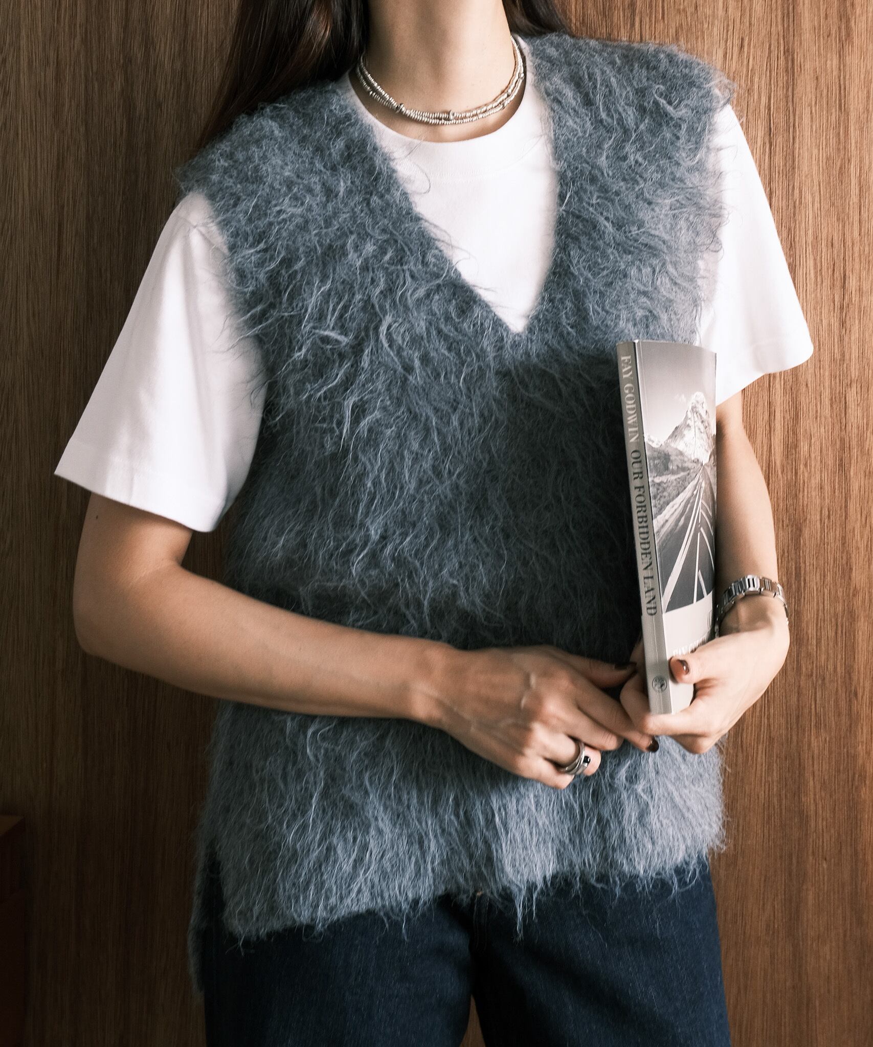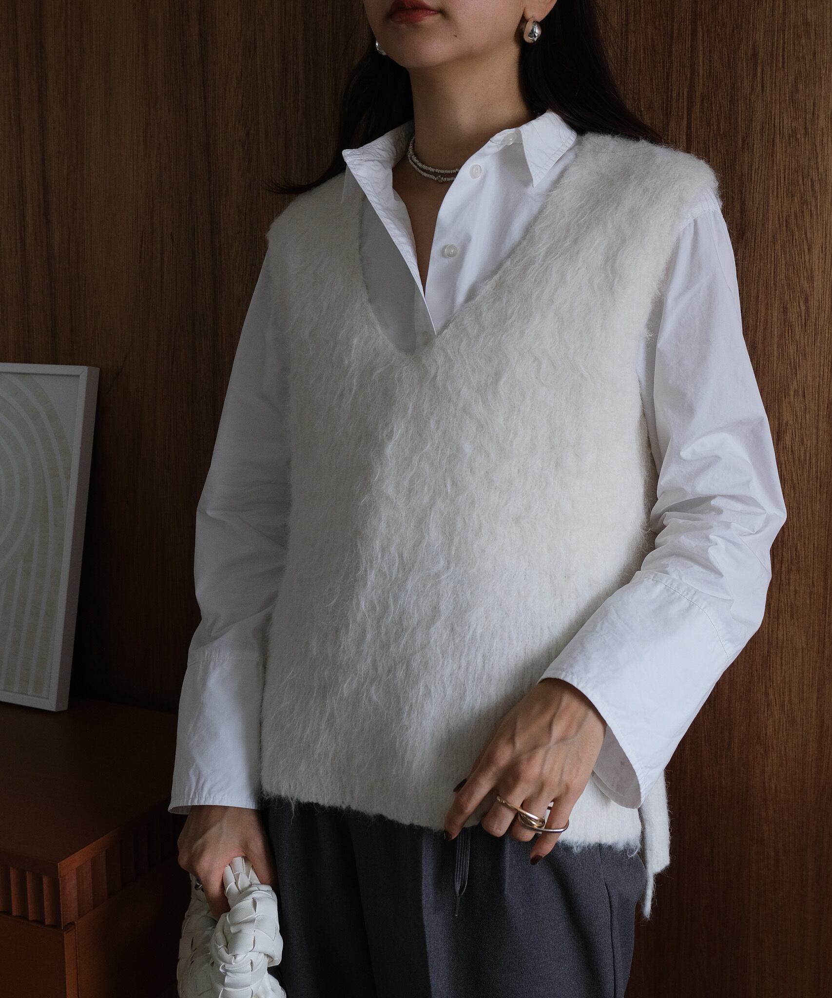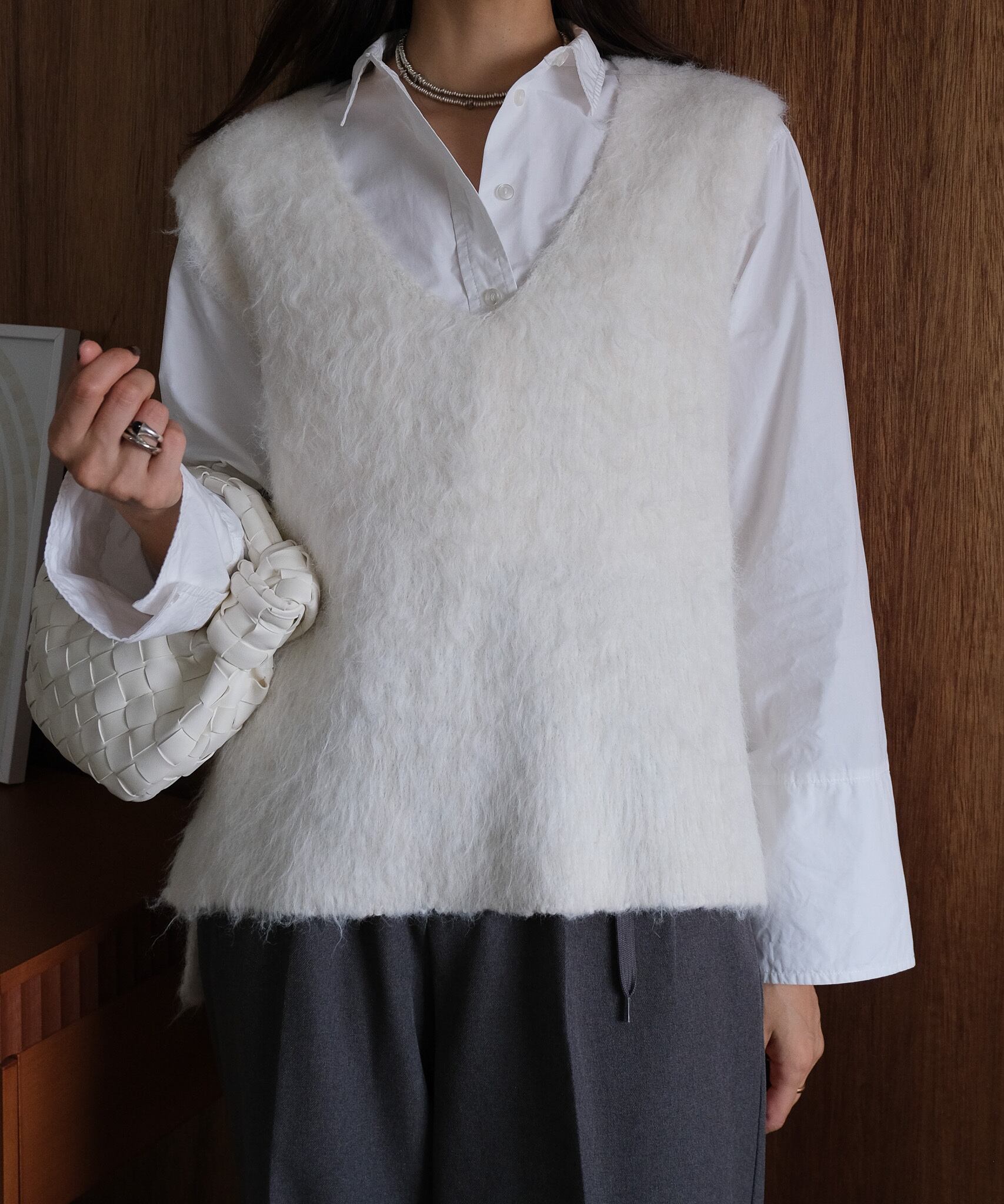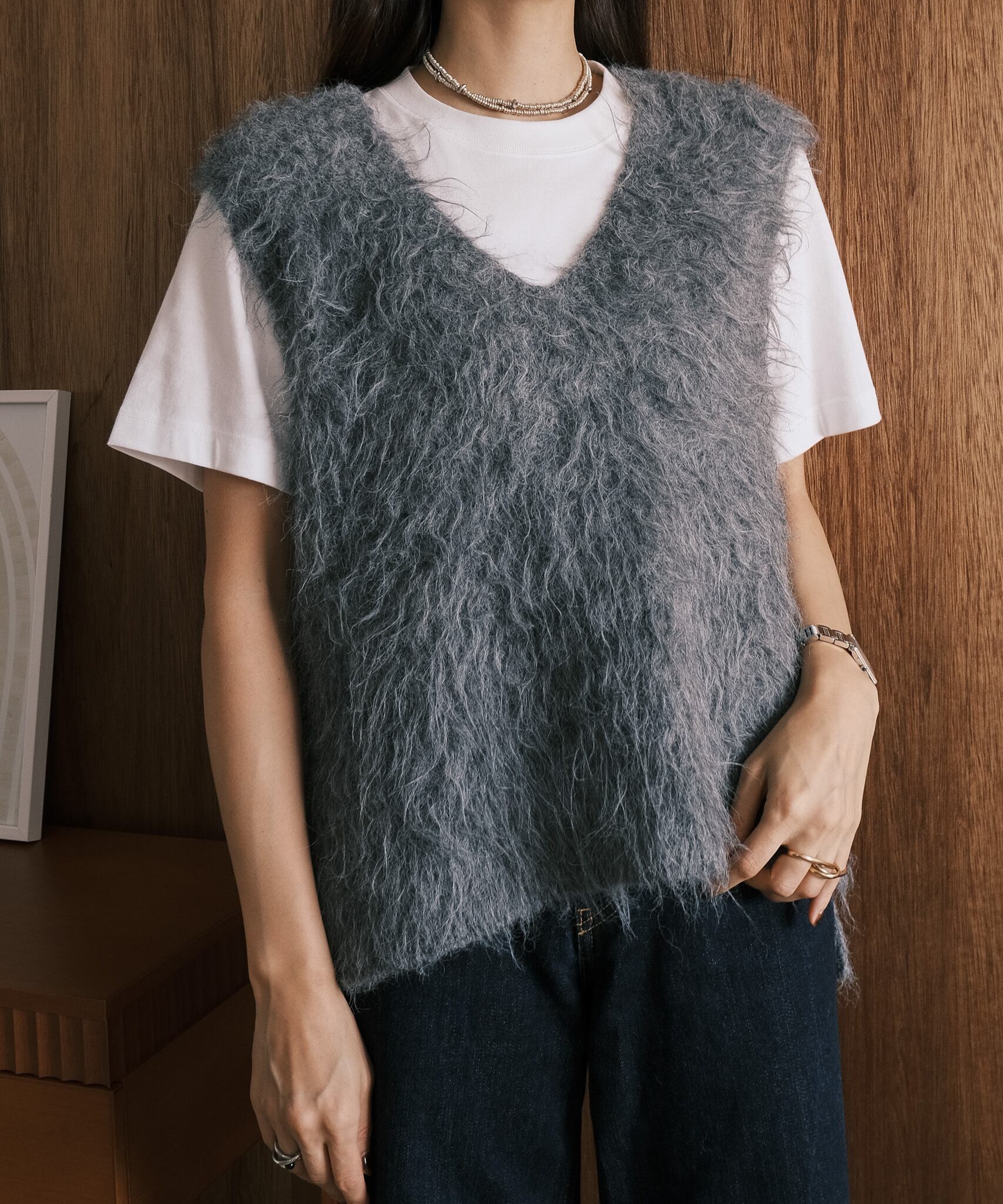 \手洗いok/今季トレンドの毛あし長めのニットベスト。Vネックはデコルテをきれいに見せてくれます。程よいゆとりを持たせたシルエットで、レイヤードスタイルもお楽しみいただけます。前後のある裾の立体感で腰回りをすっきりと着痩せし◎
