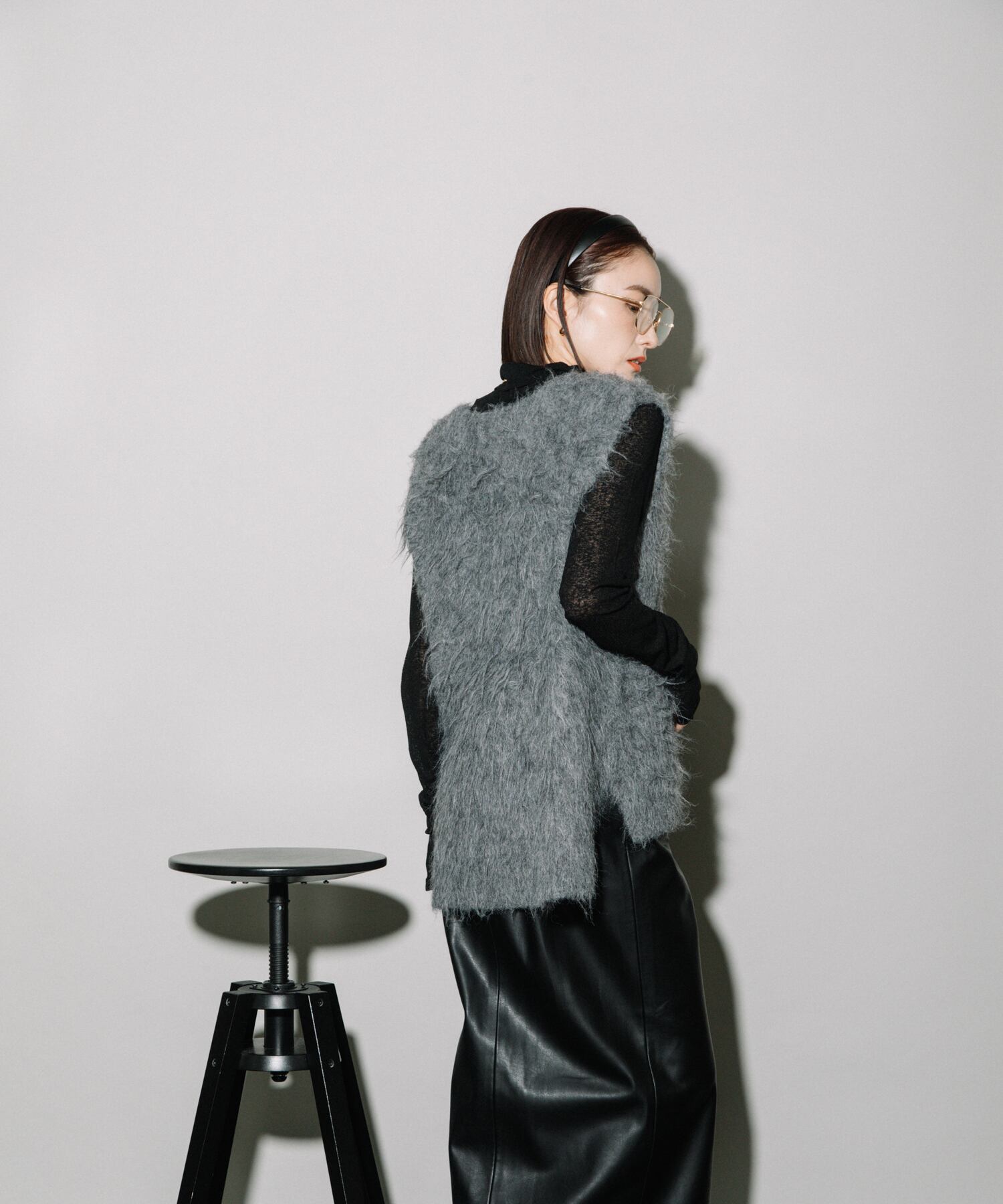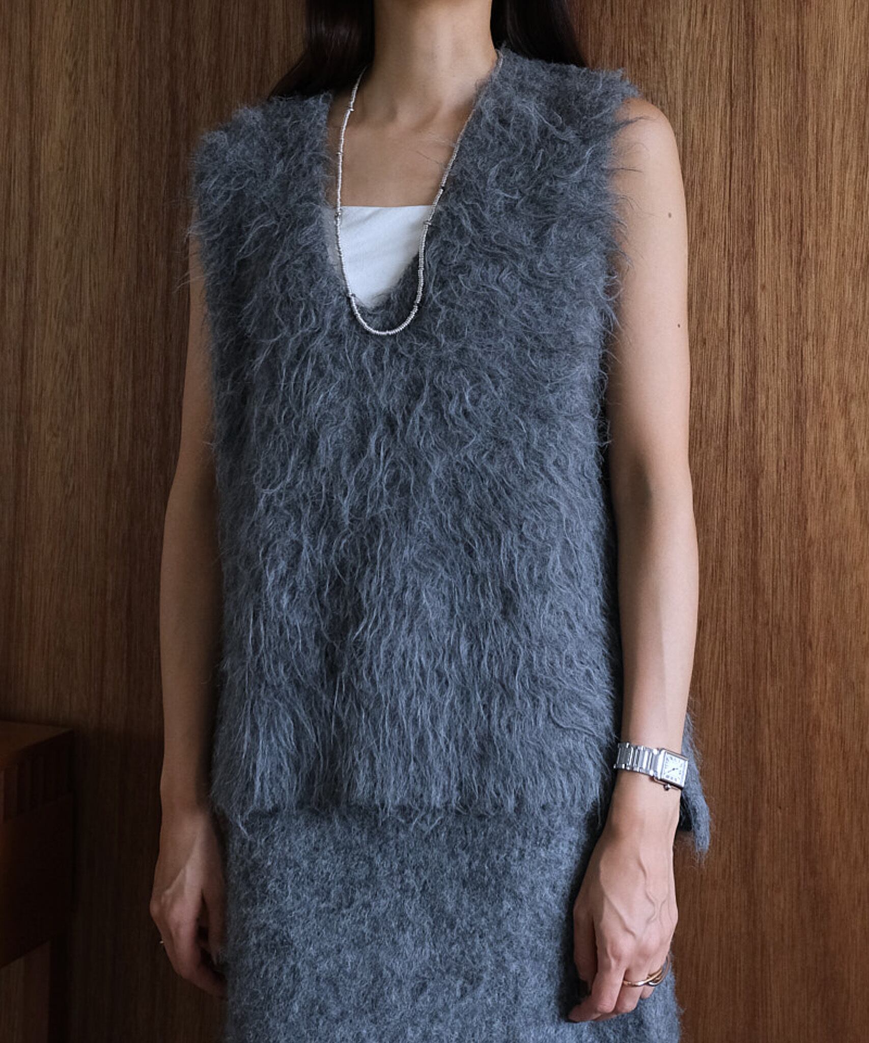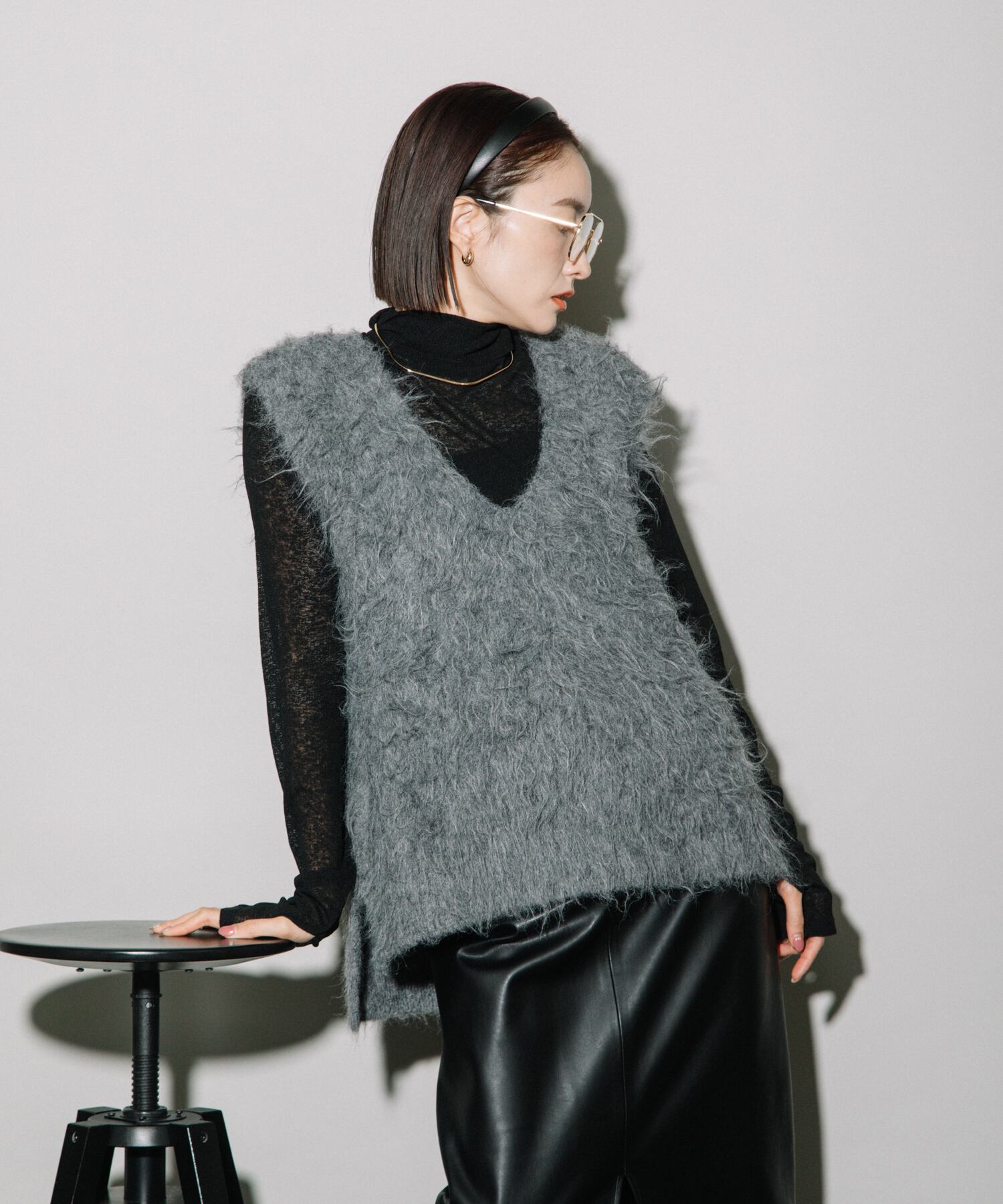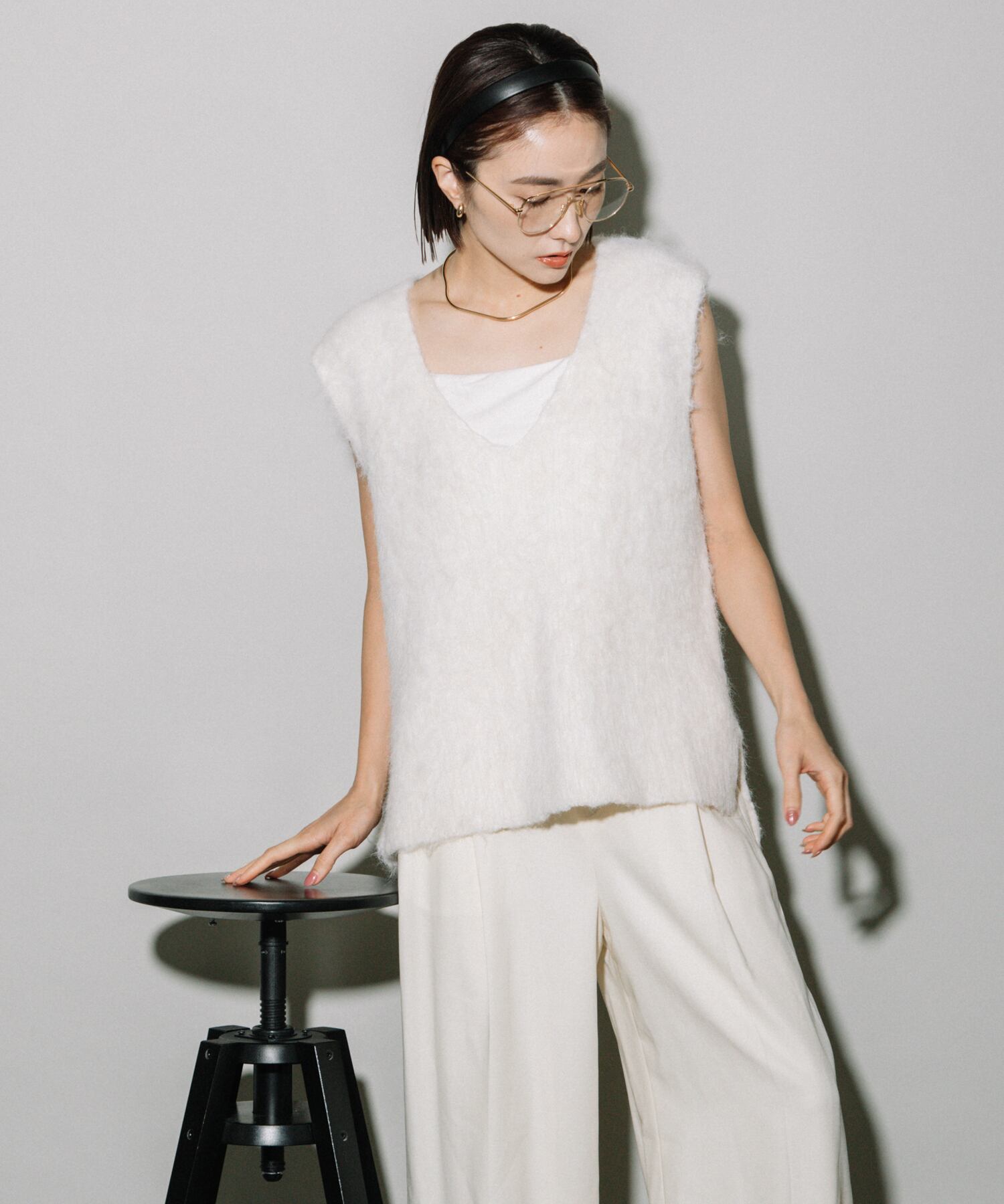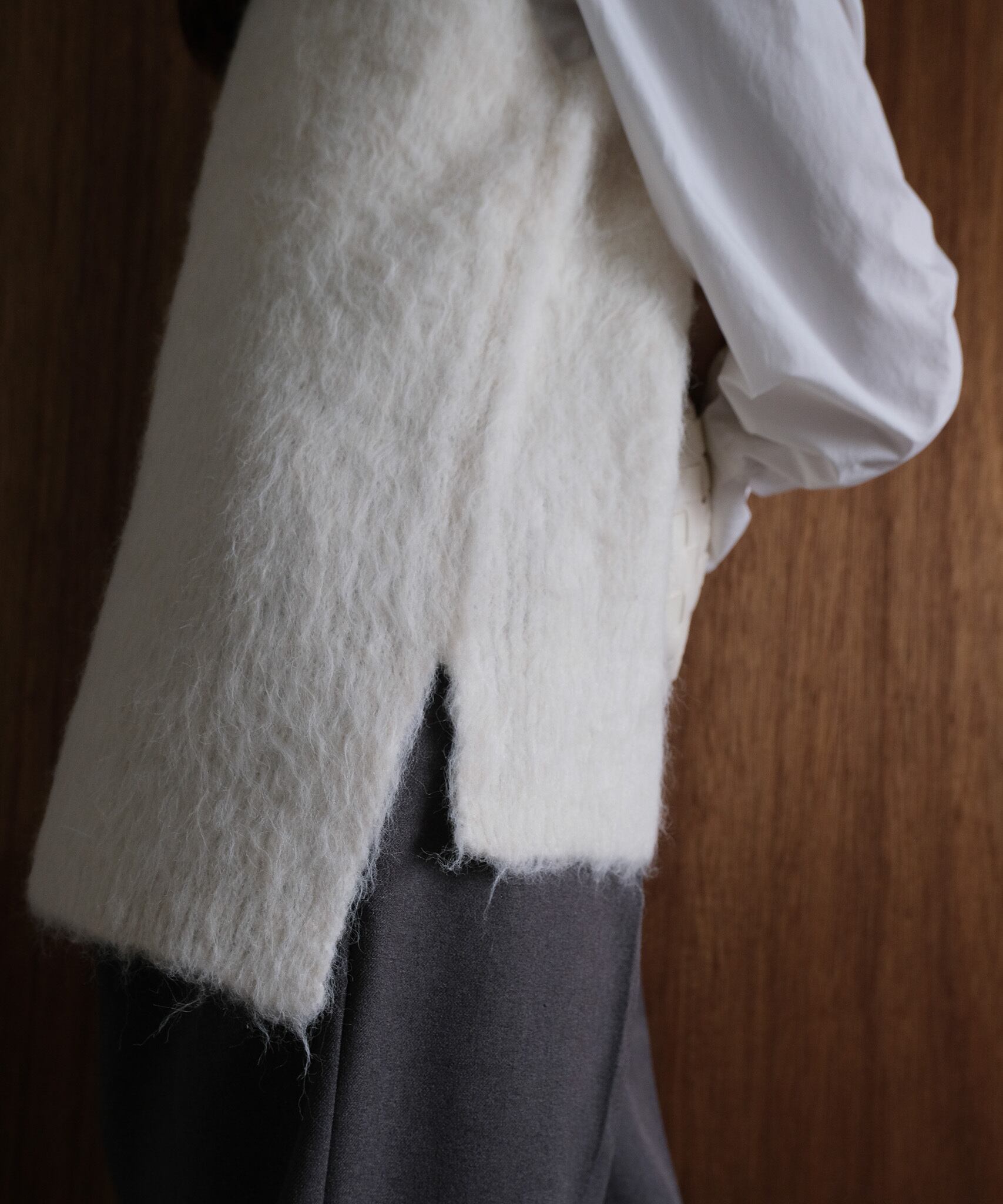 \手洗いok/今季トレンドの毛あし長めのニットベスト。Vネックはデコルテをきれいに見せてくれます。程よいゆとりを持たせたシルエットで、レイヤードスタイルもお楽しみいただけます。前後のある裾の立体感で腰回りをすっきりと着痩せし◎