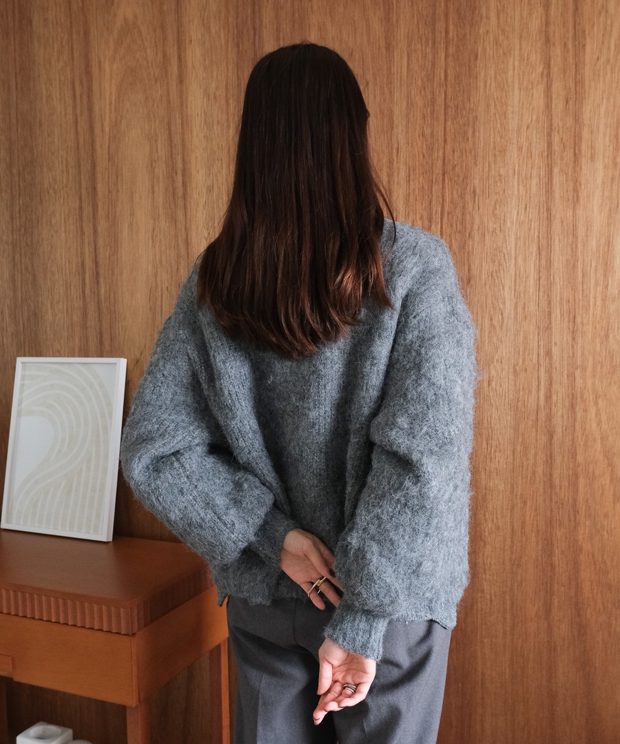 \手洗いok/旬なフェザーニットが上品さ加速させるカーディガン。[KEGAKI KNIT SKIRT(ケガキスカート)【5444027】]とのセットアップがおすすめのアイテムです。前後2WAYで着用ができ、前あきでもカーデとしても着回せます!裾のボリューム感、丈感にこだわりました。