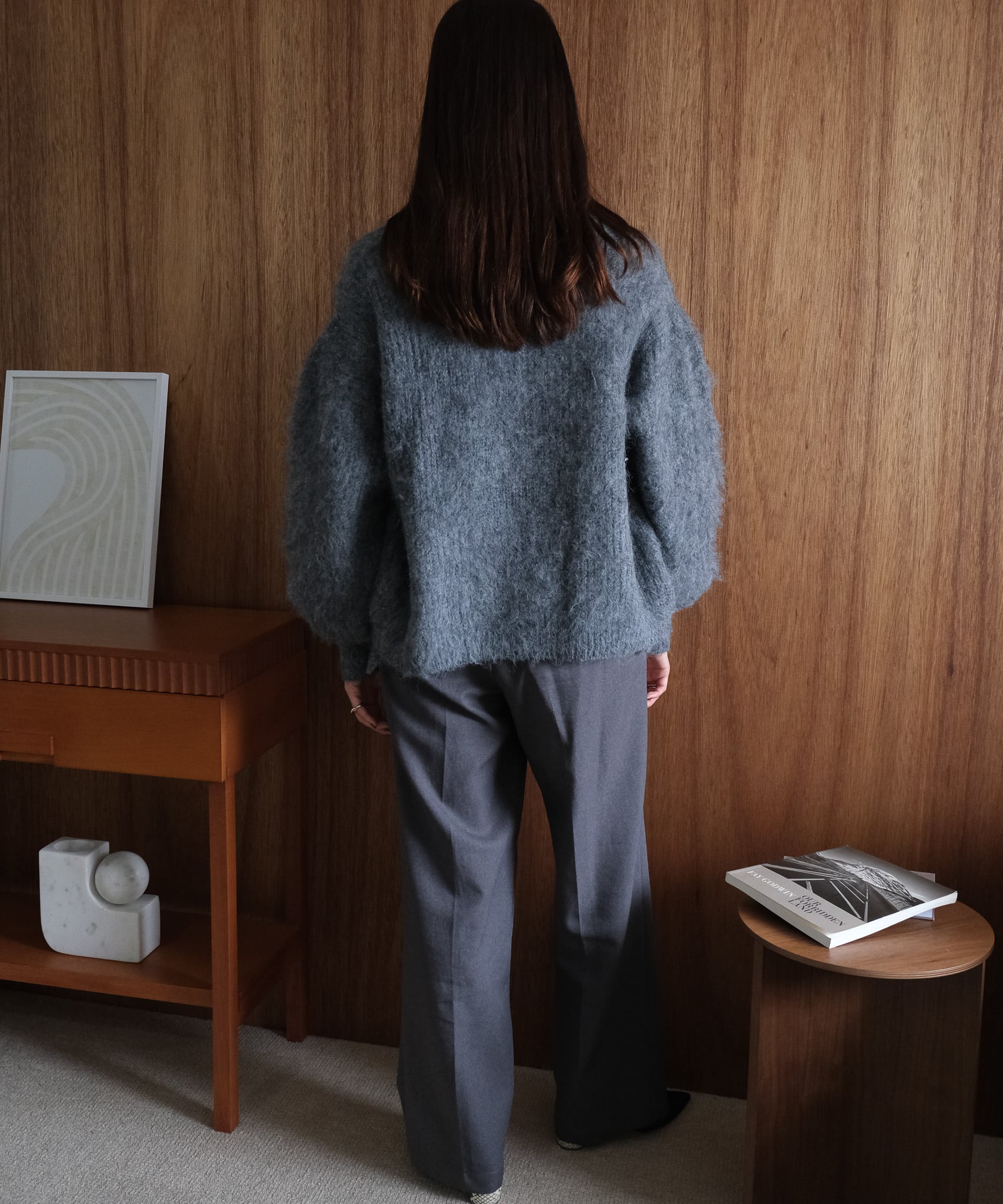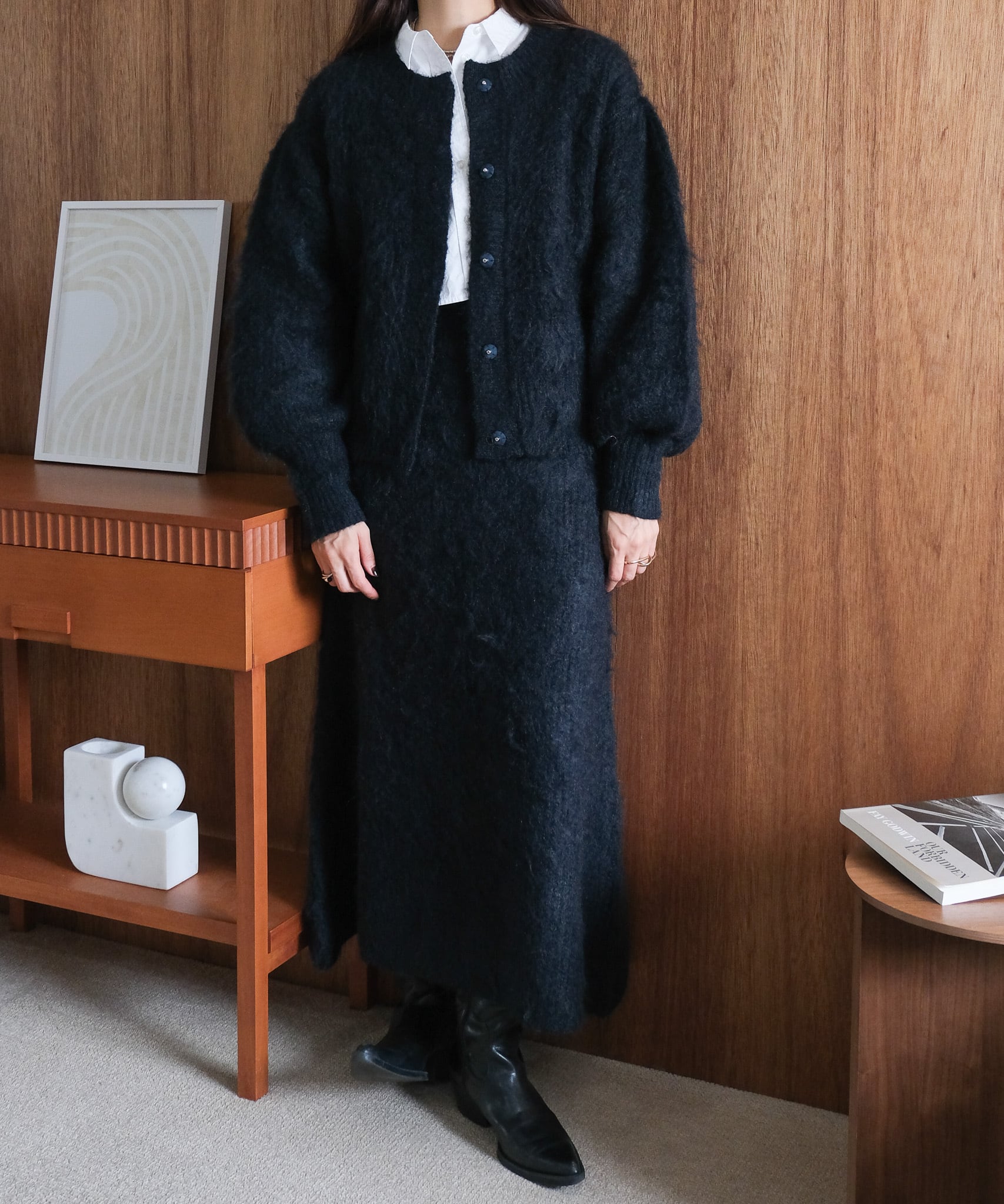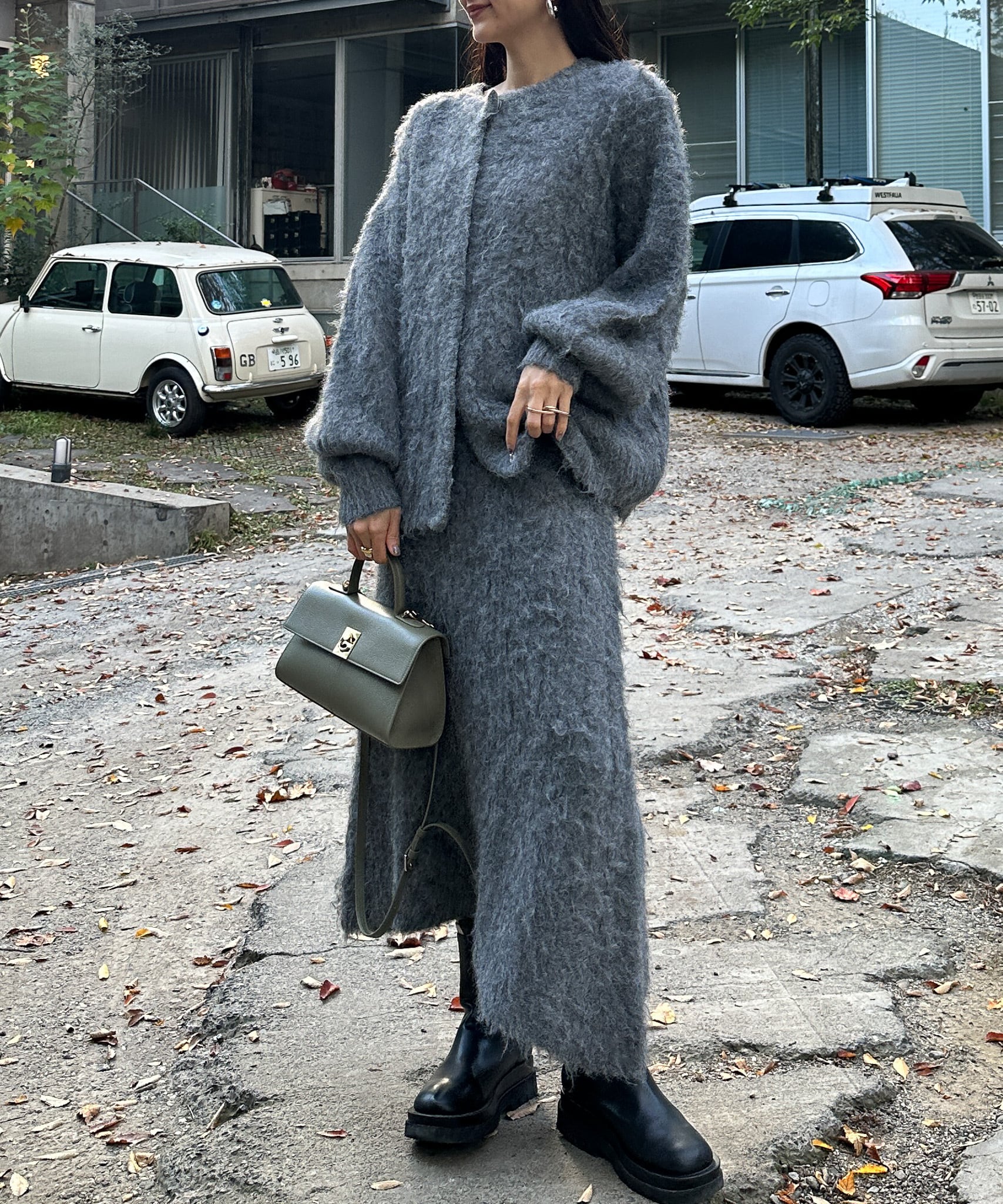 フェザーニット素材が得意な骨格ウェーブさん。デコルテ周りが寂しくならないようにハイネックのインナーと合わせるとよりバランスが出て◎。腰回りまで隠れるサイズ感なのでパンツスタイリングにもハマります。足元に重心が来ないように、靴はヒールのあるものや足首が見えるようなものを合わせるとさらにこなれ感も。