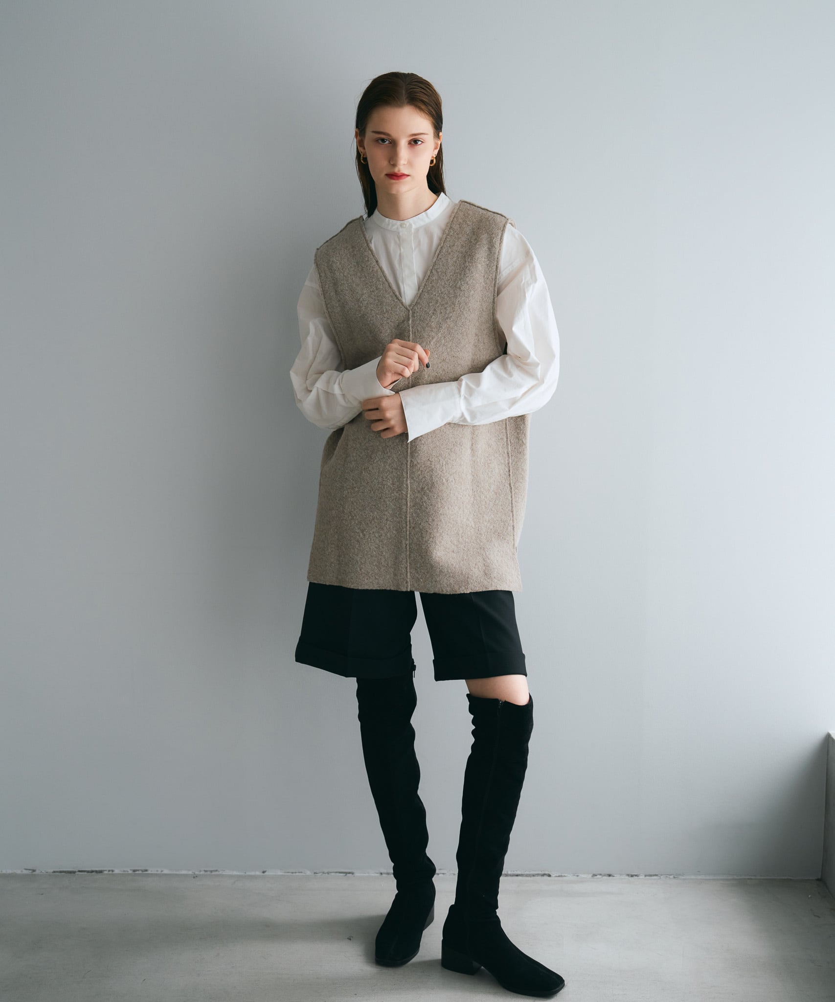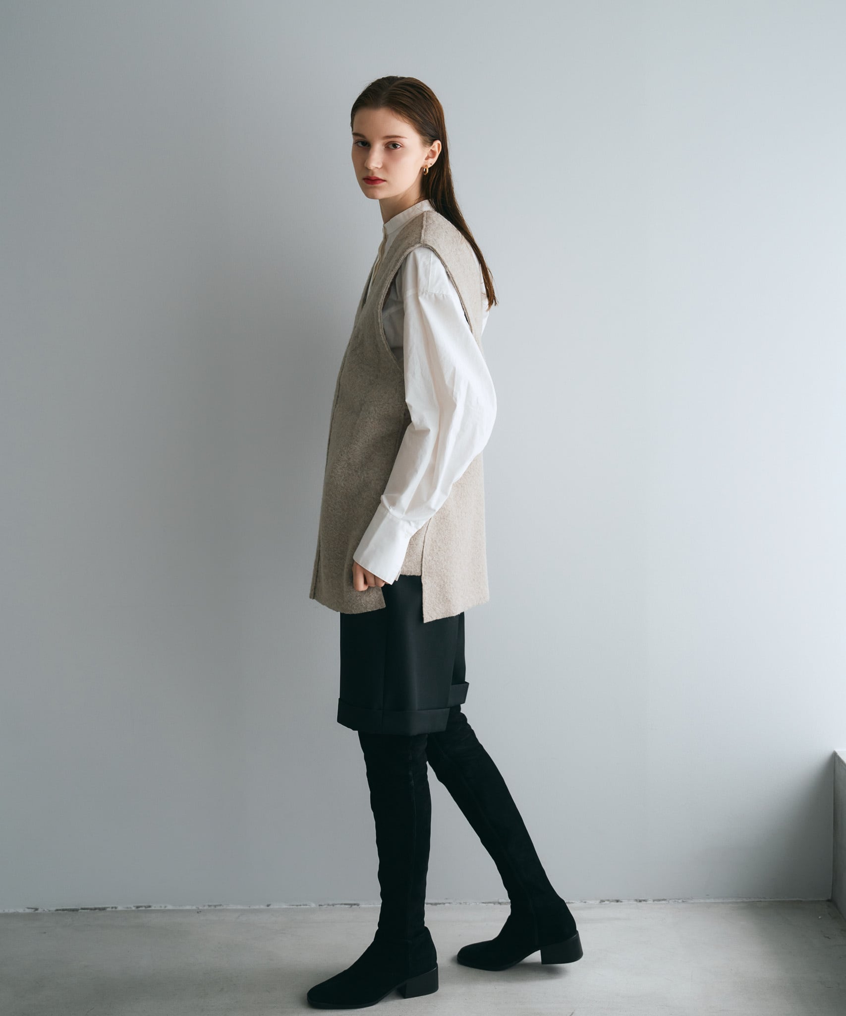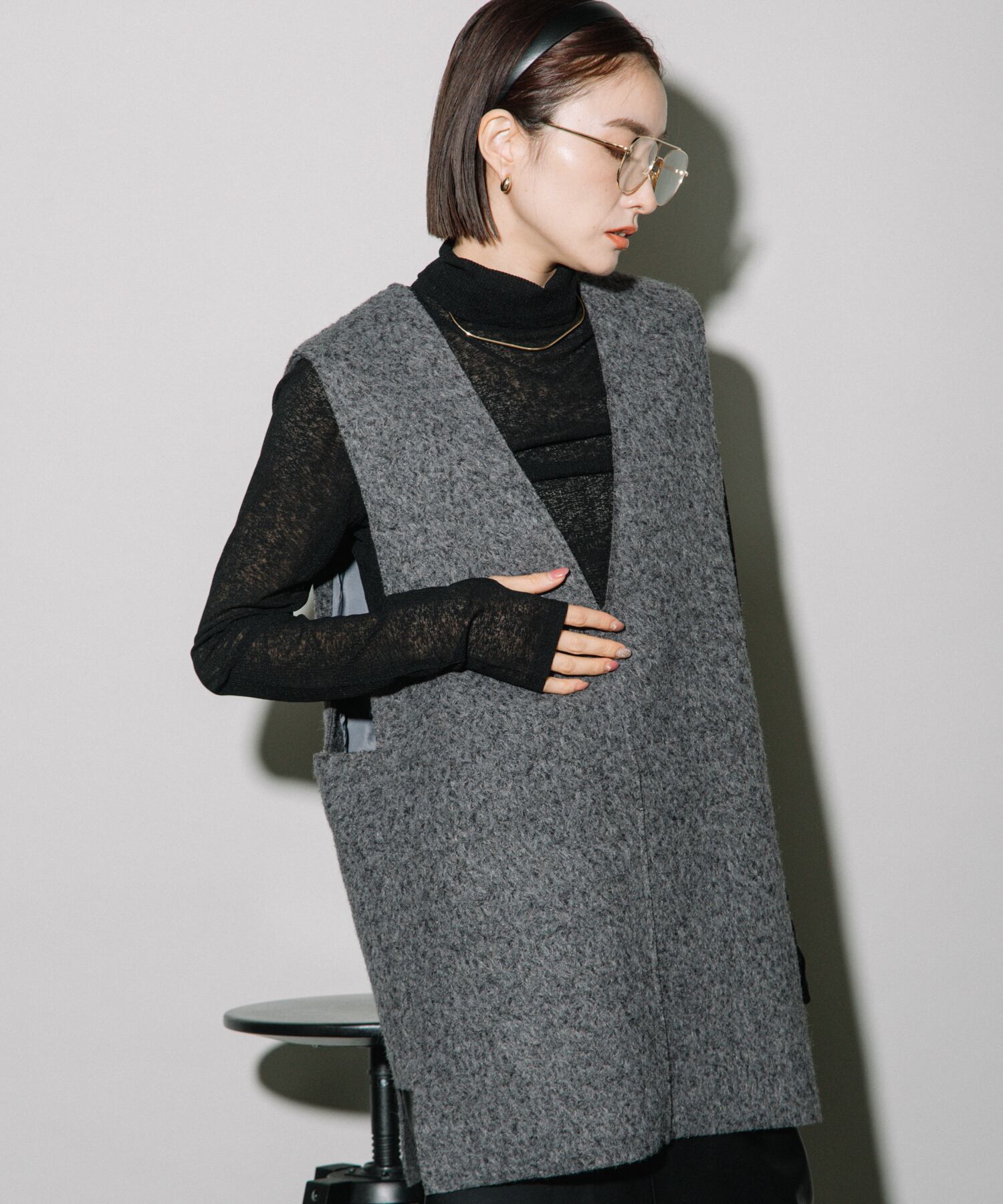 Tシャツ・キャミソール・ハイネックセーター・シアートップス・ボリュームブラウスなど幅広いアイテムとレイヤード可能です。デコルテはスッキリとあくのでネックレスなどで華やかさをプラスすると◎低身長さんは、ショートパンツあわせでロングブーツとのスタイリングもおすすめです。