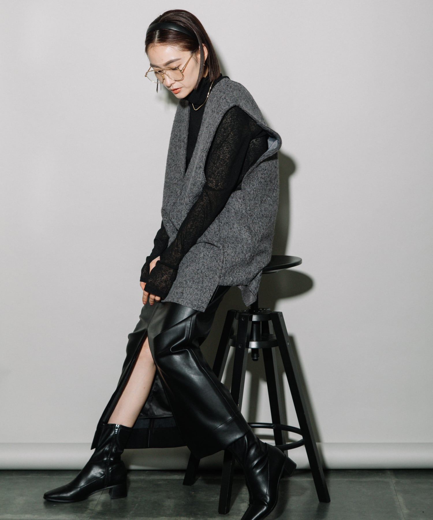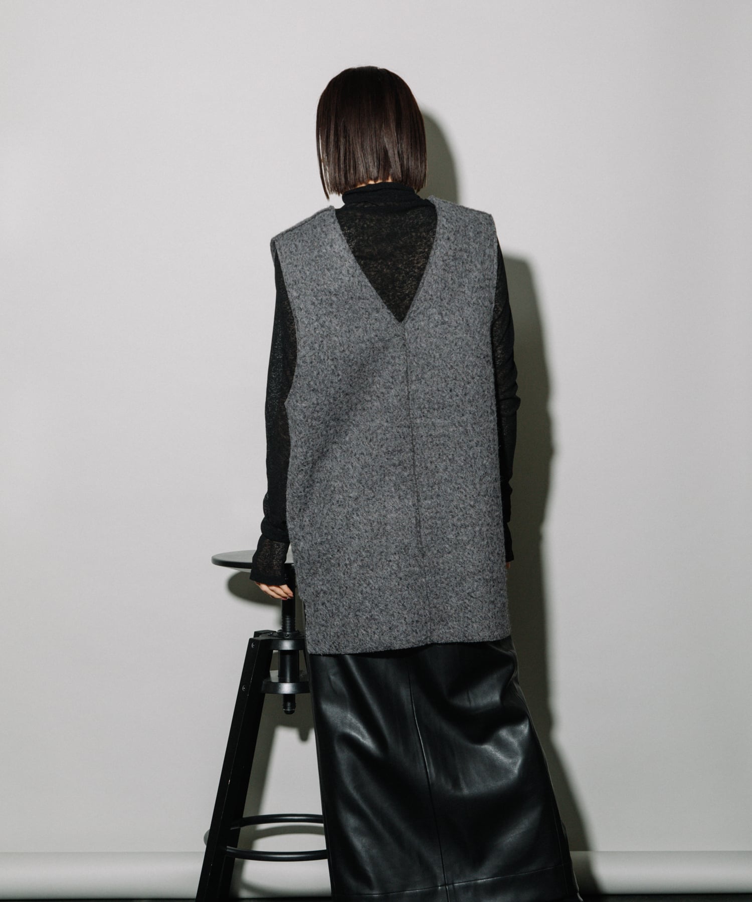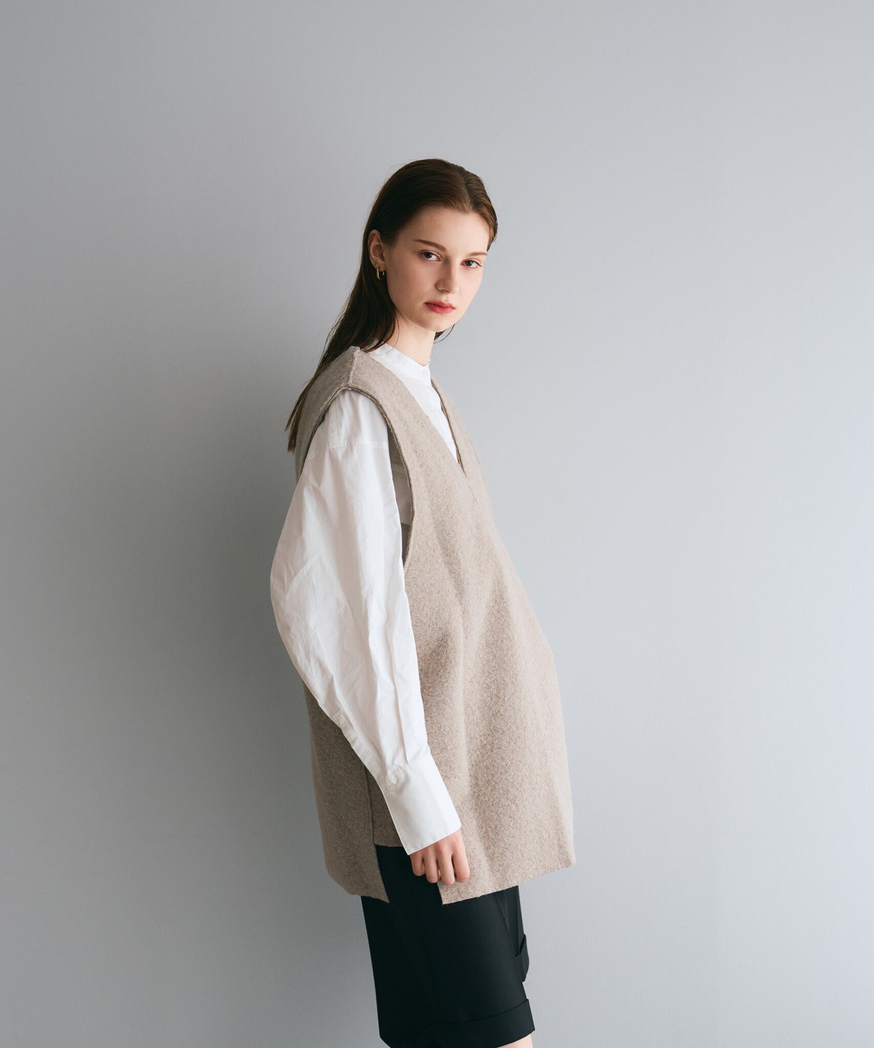 Tシャツ・キャミソール・ハイネックセーター・シアートップス・ボリュームブラウスなど幅広いアイテムとレイヤード可能です。デコルテはスッキリとあくのでネックレスなどで華やかさをプラスすると◎低身長さんは、ショートパンツあわせでロングブーツとのスタイリングもおすすめです。