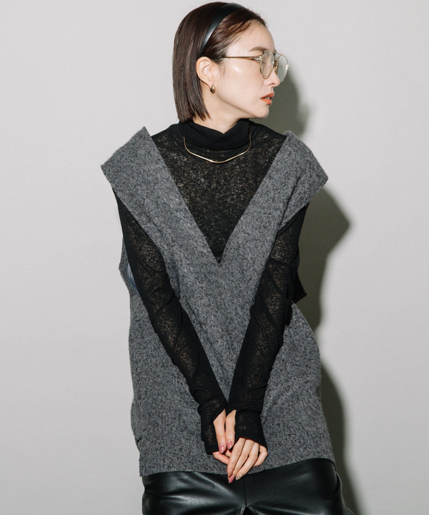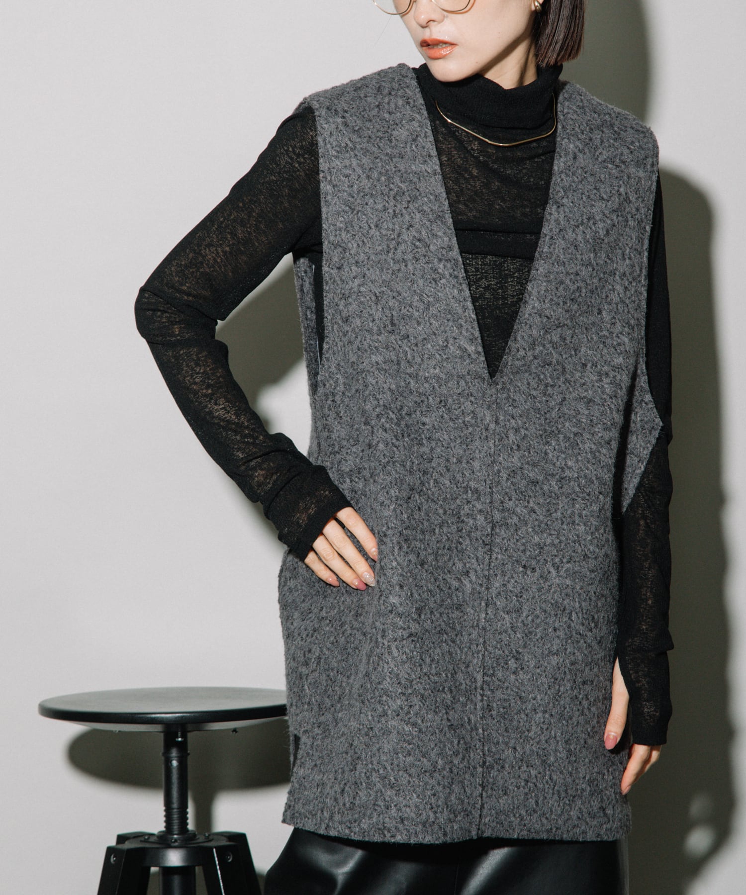 上半身に厚みがあるストレートタイプさん、首を長く見せてくれる透け感のあるトップスアイテムとの重ね着がおすすめです!