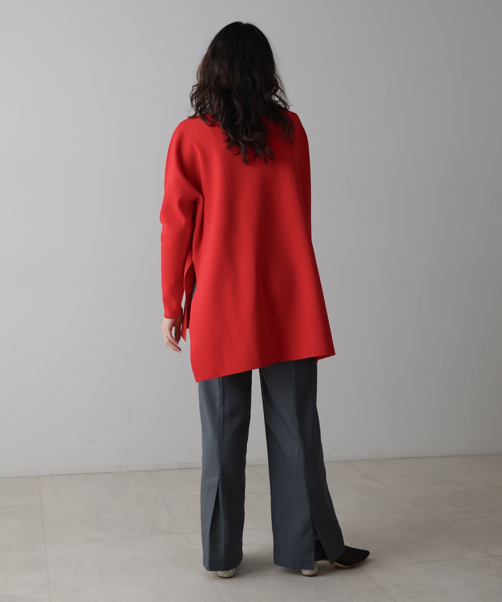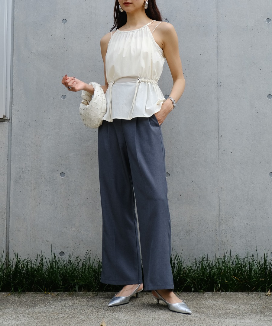ハイウエストシルエットが気になる腰回りをすっぽりとカバーしてくれる、着痩せパンツ。深めに入った裾のスリットに、膝下からのフレアラインなどとことん美脚に見えるように追求。太めのベルトラインもアクセントになり、INしてもOUTしても使いまわせます。