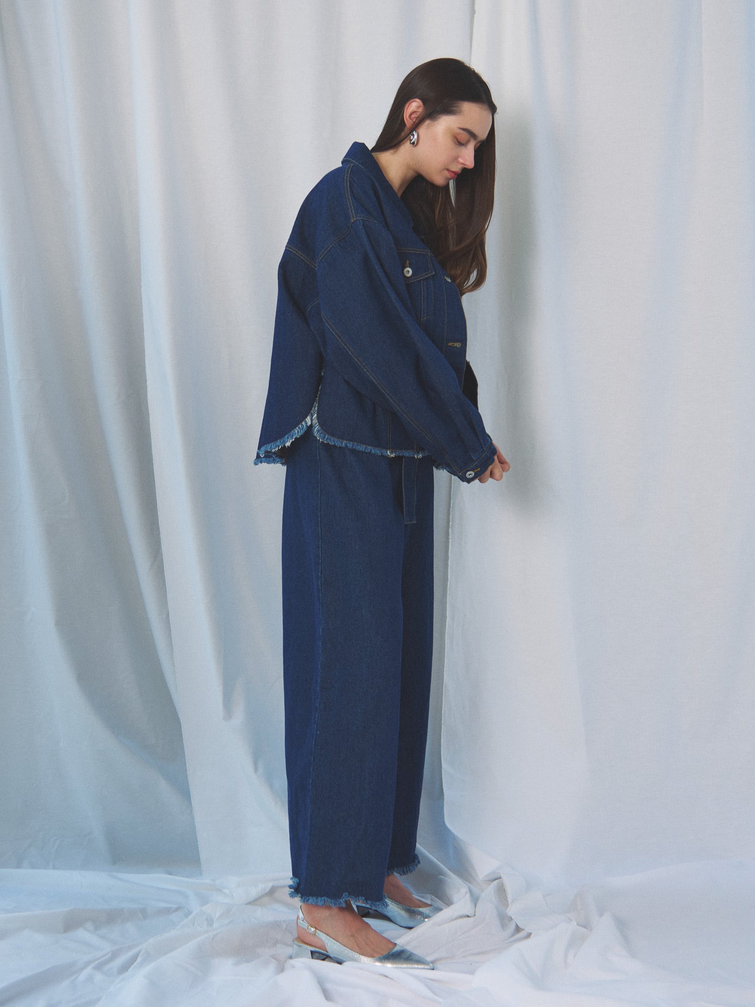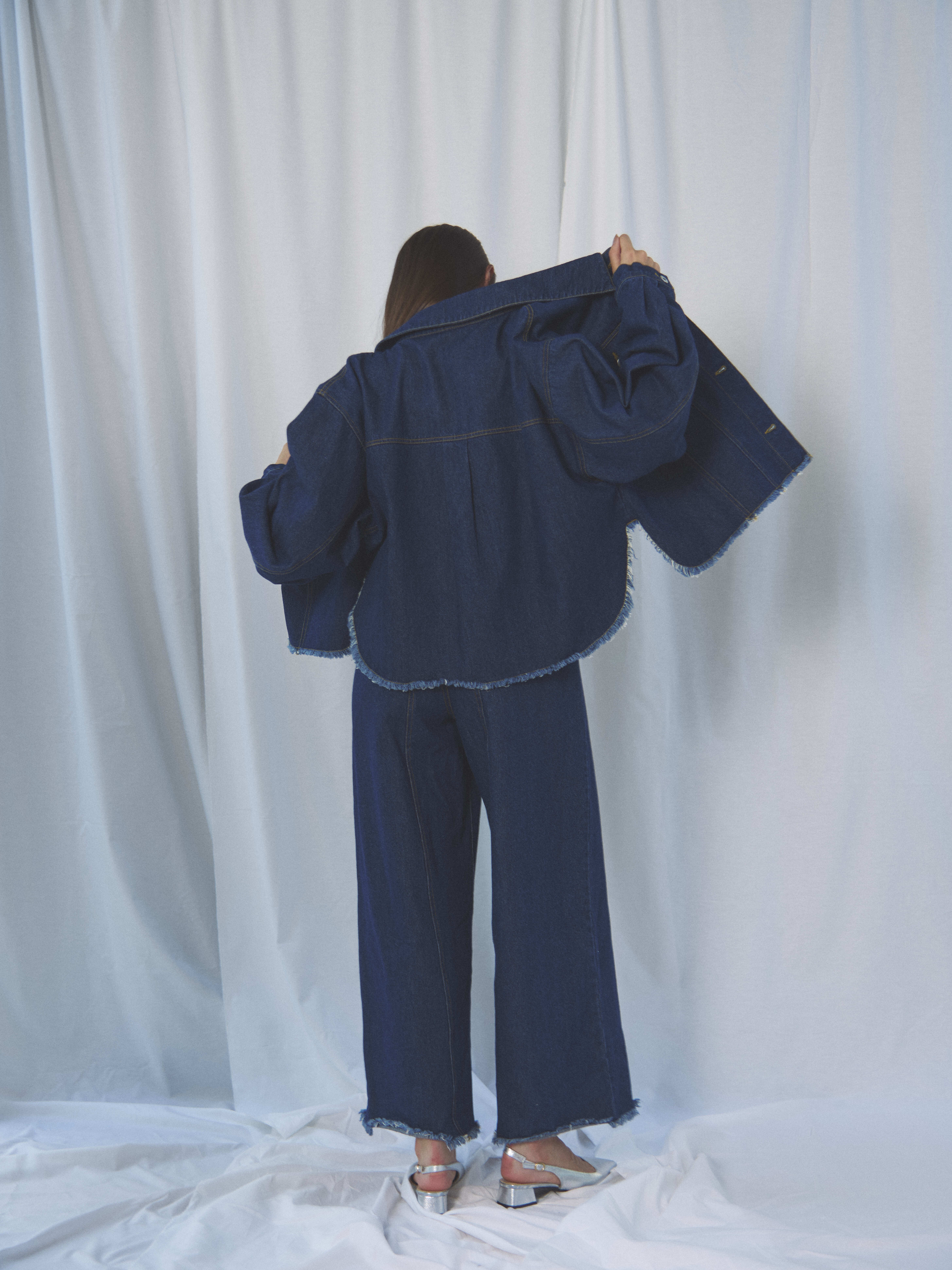 羽織るだけで旬なシルエットを楽しめるデニムジャケット。裾のフリンジ感やサイドシルエットが立体的で、シーズンムードを高めてくれます。アームホールが広めなので、肉厚なニットを着用しても着脱がスムーズなのも嬉しいポイント。360°どこからみても形のきれいさが際立つアイテムです。