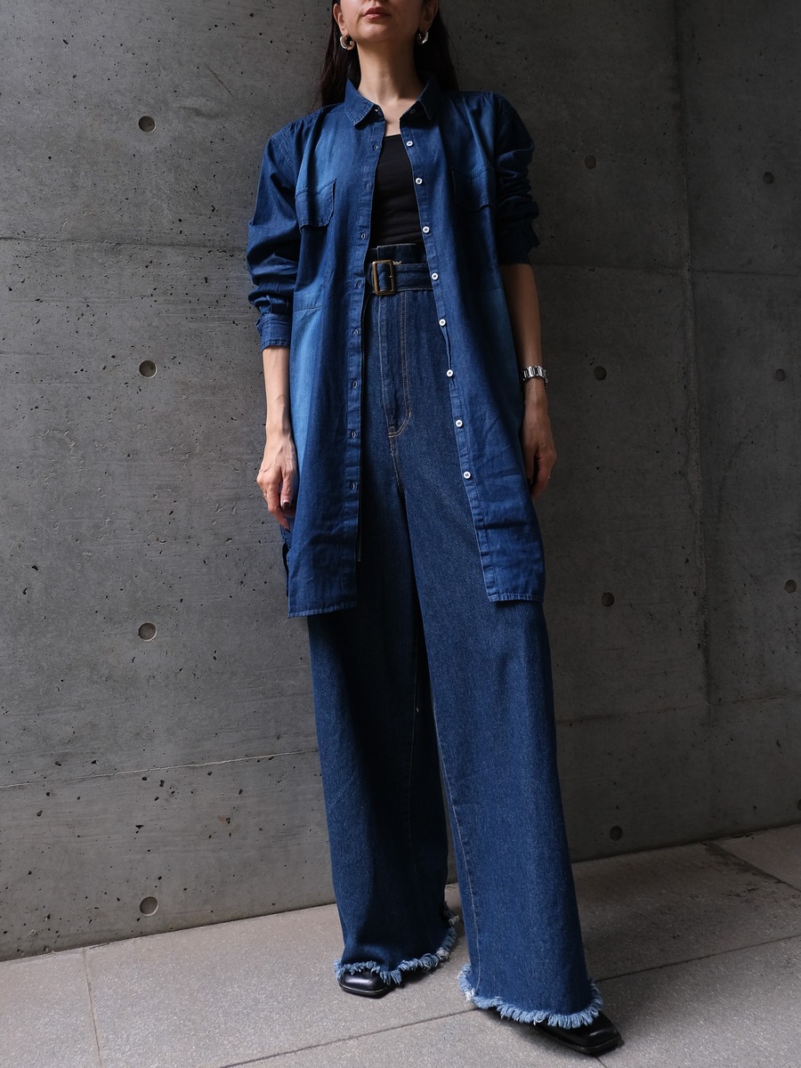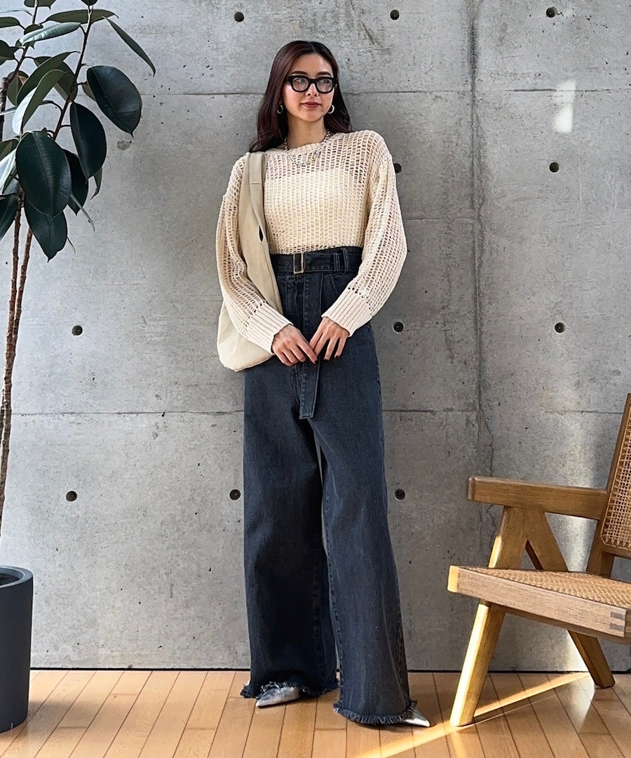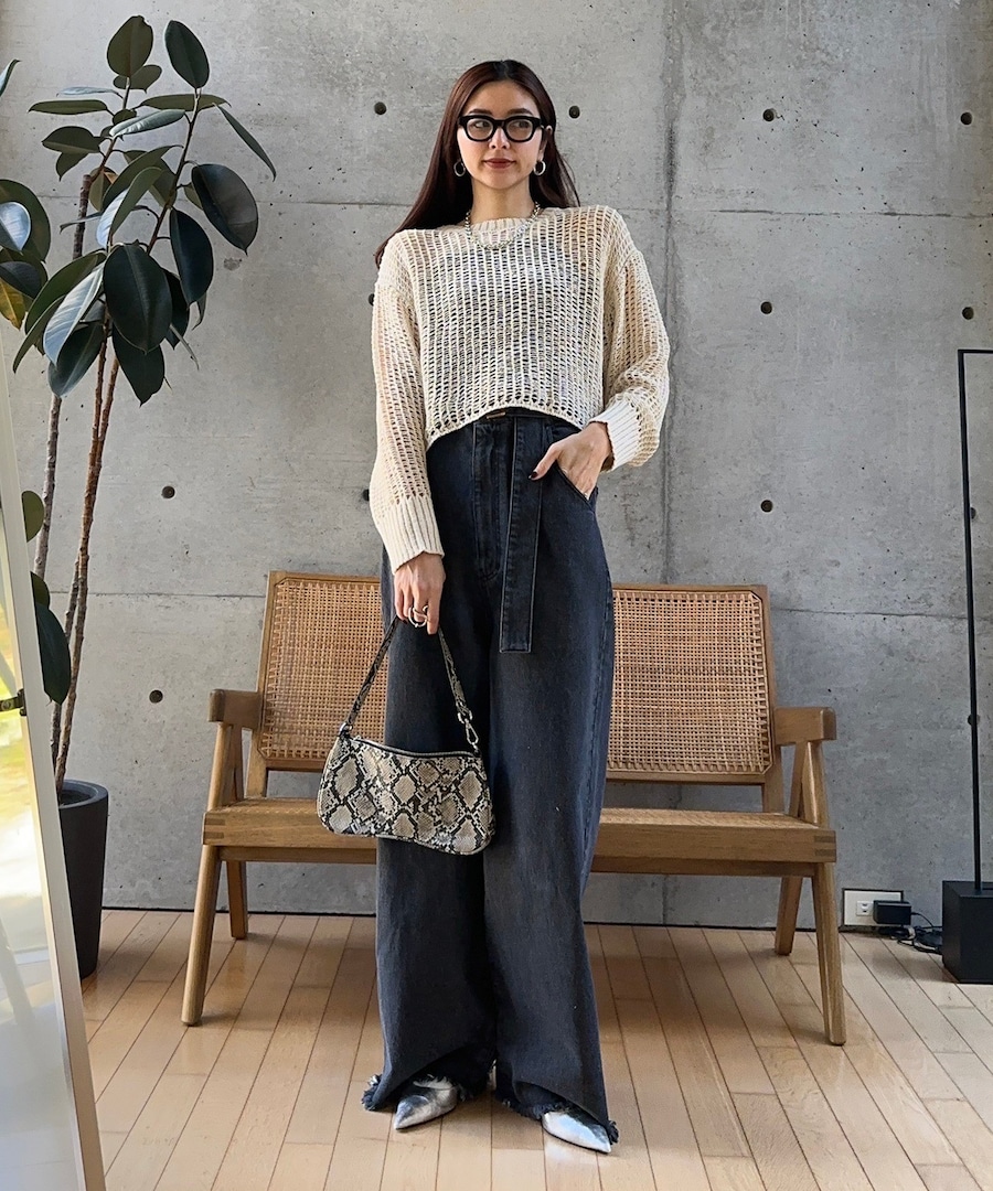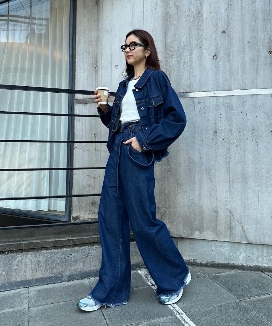 FRINGE DENIM JACKET(フリンジデニムジャケット)【5513027】とのセットアップスタイルがおすすめです。ボトムスにボリュームがあるので、トップスはコンパクトにすると着膨れしません。Tシャツ・シアートップス・ブラウス・トレーナー・セーターなど幅広いアイテムとのコーディネートをお楽しみください。